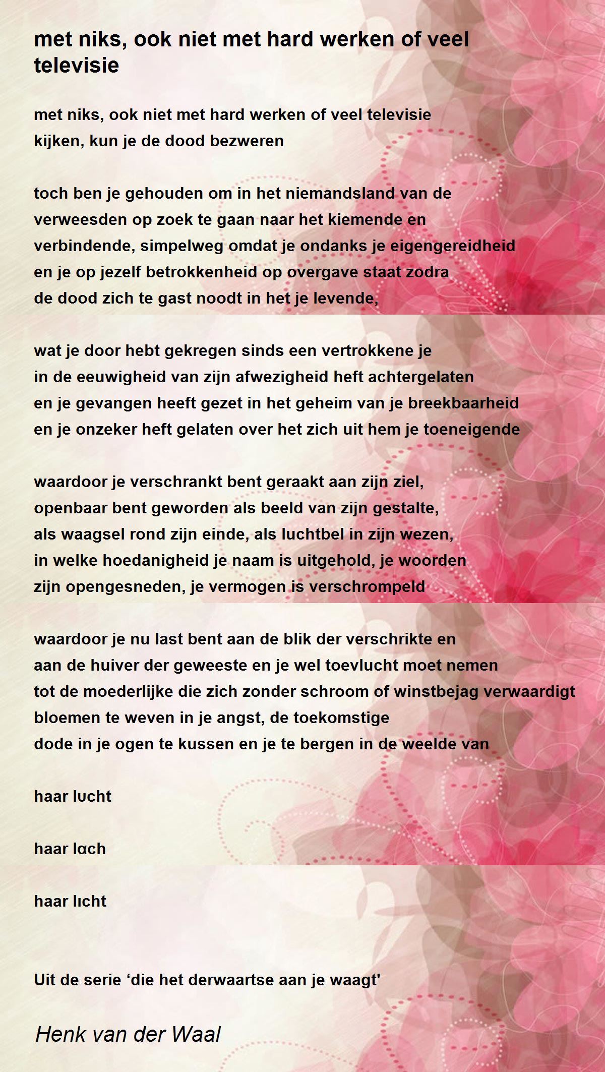 tot de moederlijke die zich zonder schroom of winstbejag verwaardigt bloemen te weven in je angst, de toekomstige