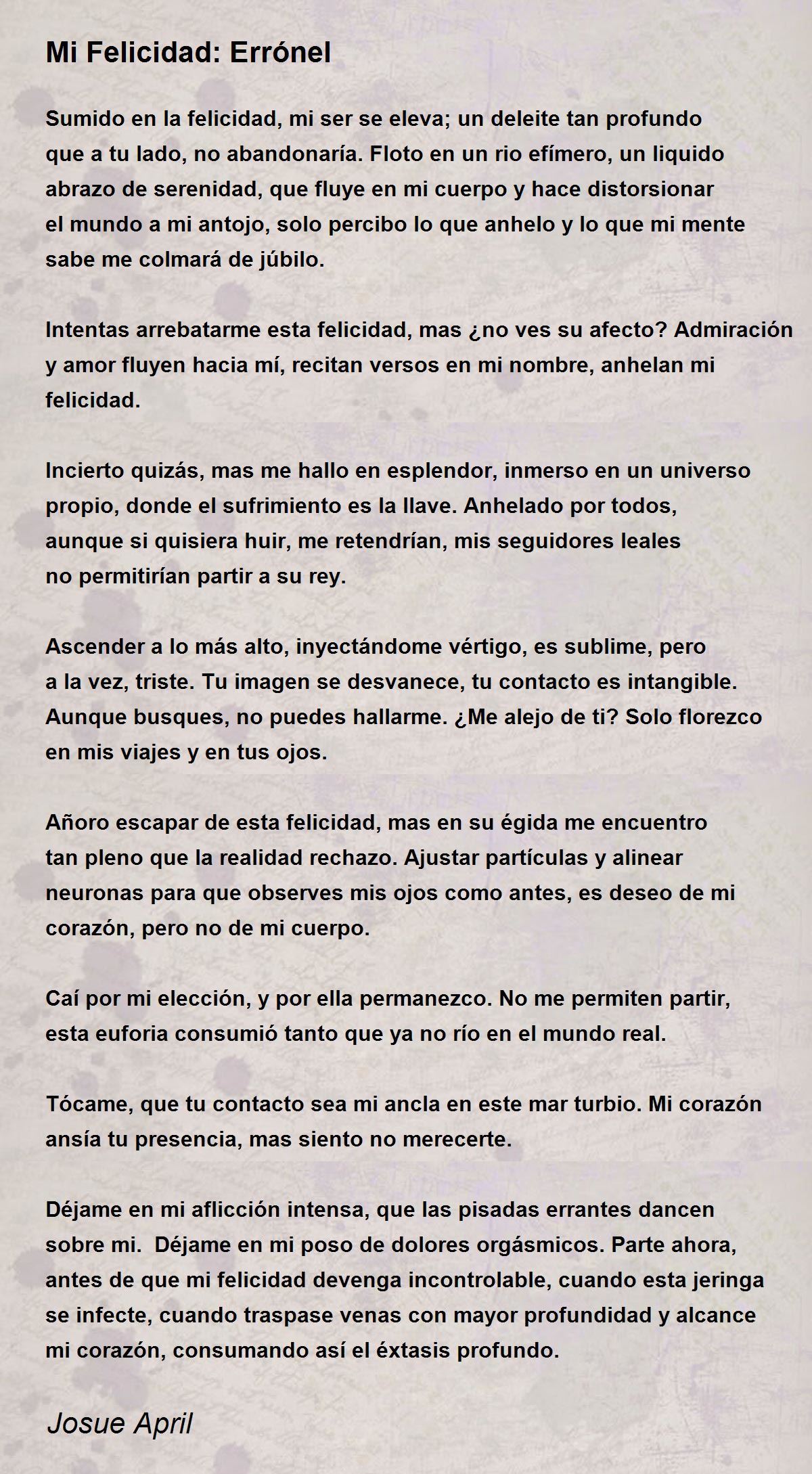 Sumido en la felicidad, mi ser se eleva; un deleite tan profundo que a tu lado, no abandonaría. Floto en un rio efímero, un liquido abrazo de serenidad, que fluye en mi cuerpo y hace distorsionar el mundo a mi antojo, solo percibo lo que anhelo y lo que mi mente sabe me colmará de júbilo.