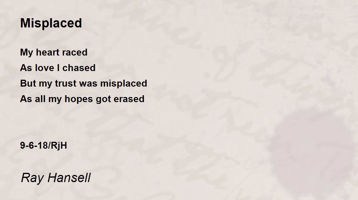 My heart raced As love I chased But my trust was misplaced As all my hopes got erased 9-6-18/RjH