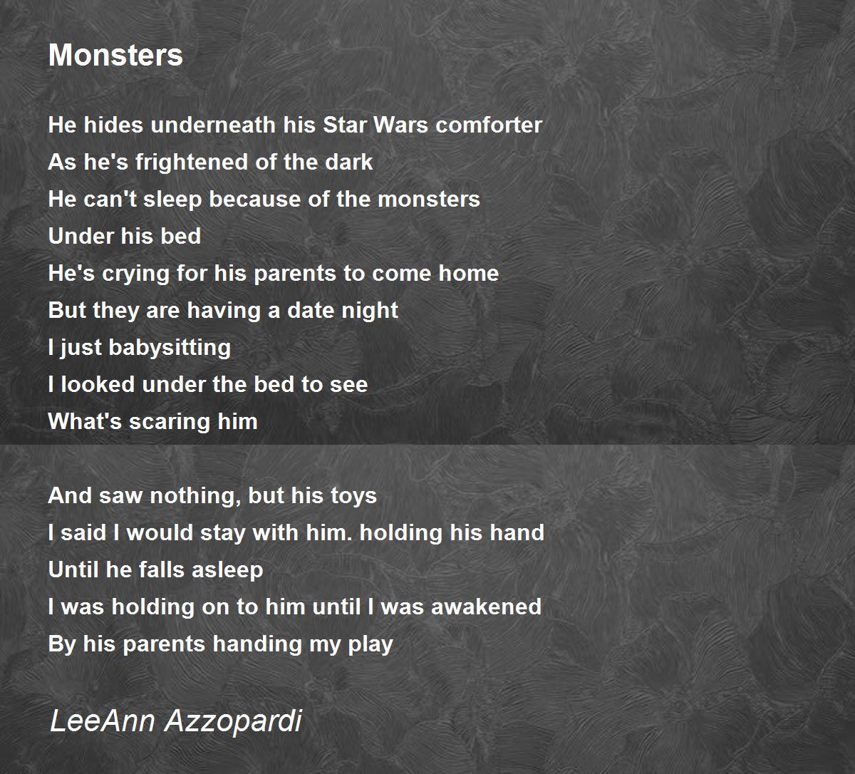 Absolutely brilliant and impressive poem. Even some adults may feel like kids and monsters today! Great job. thanks!