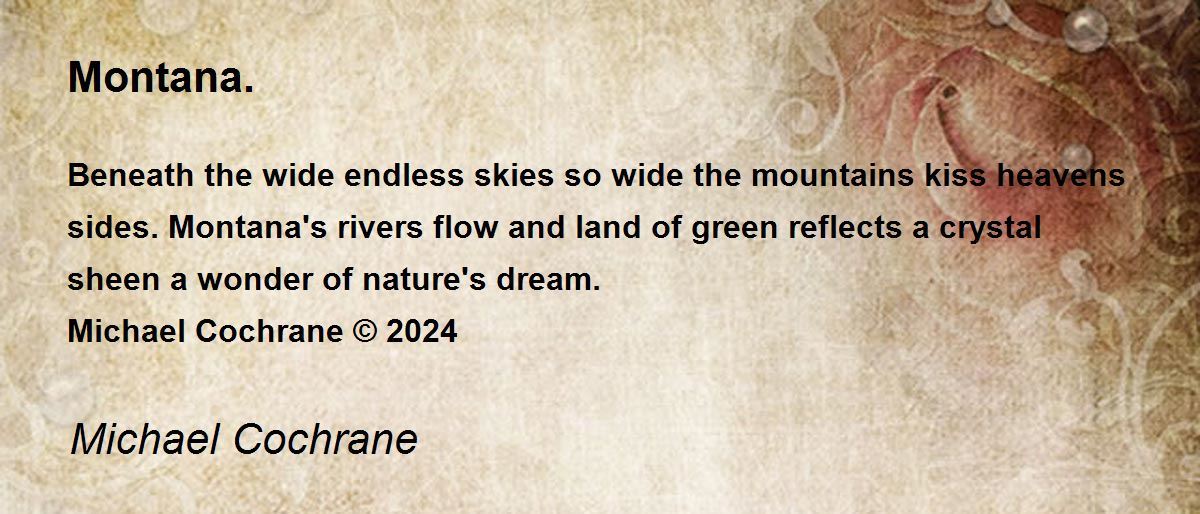 Beneath the wide endless skies so wide the mountains kiss heavens sides. Montana's rivers flow and land of green reflects a crystal sheen a wonder of nature's dream.