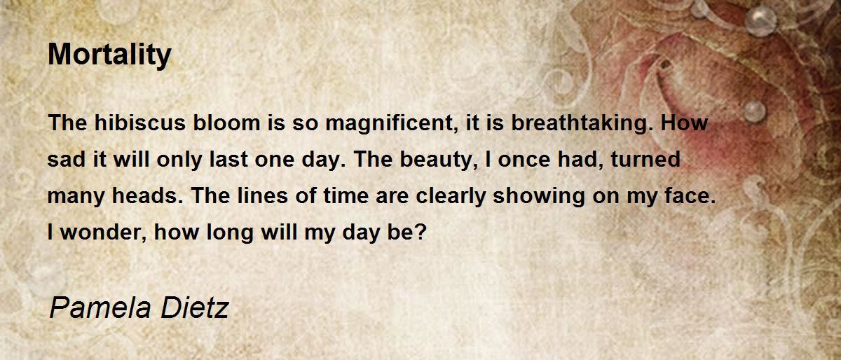 The hibiscus bloom is so magnificent, it is breathtaking. How sad it will only last one day. The beauty, I once had, turned many heads. The lines of time are clearly showing on my face. I wonder, how long will my day be?