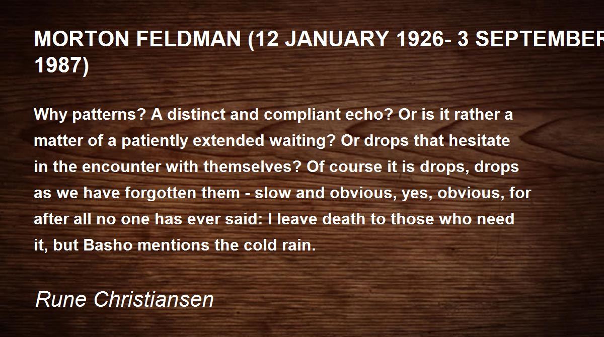 Why patterns? A distinct and compliant echo? Or is it rather a matter of a patiently extended waiting? Or drops that hesitate in the encounter with themselves? Of course it is drops, drops as we have forgotten them - slow and obvious, yes, obvious, for after all no one has ever said: I leave death to those who need it, but Basho mentions the cold rain.