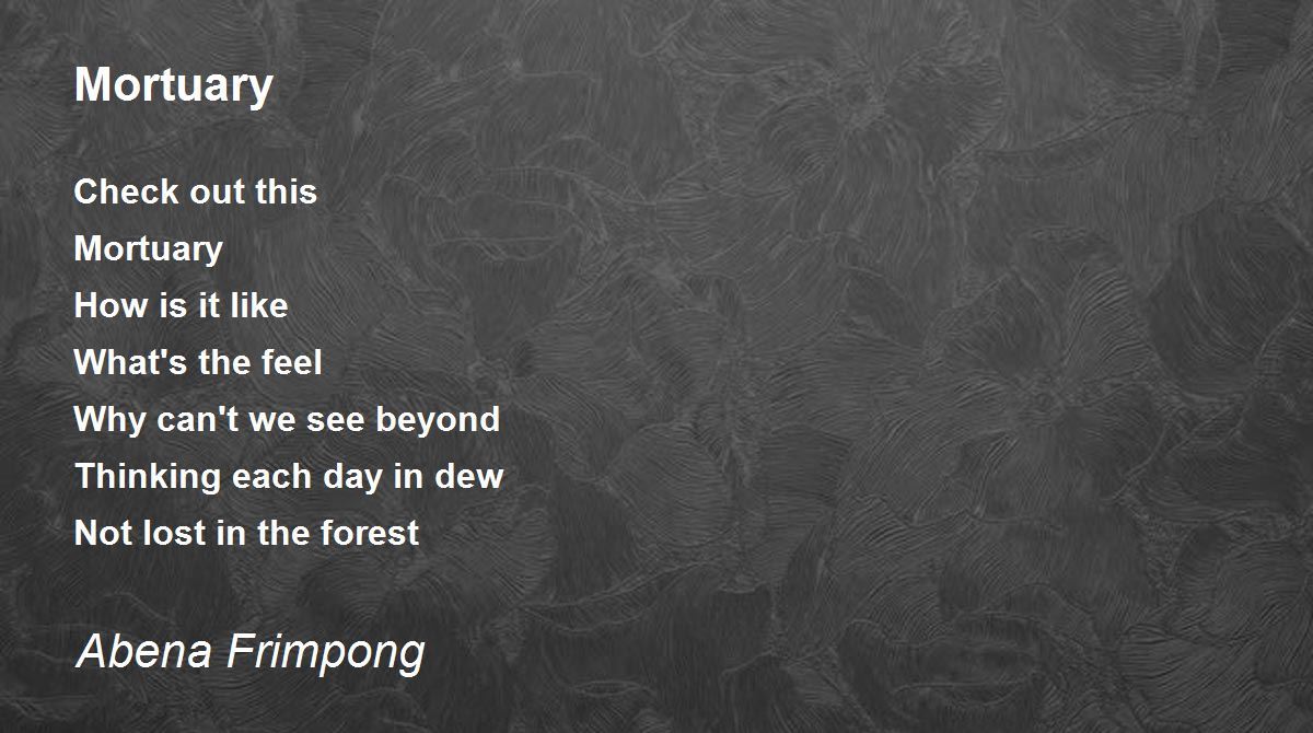 Check out this Mortuary How is it like What's the feel Why can't we see beyond Thinking each day in dew Not lost in the forest