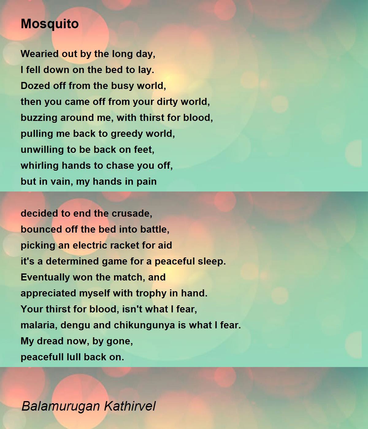 bounced off the bed into battle, picking an electric racket for aid it's a determined game for a peaceful sleep. thirst for the blood of the mosquito. very nice poem and very descriptive. thank u dear poet. tony