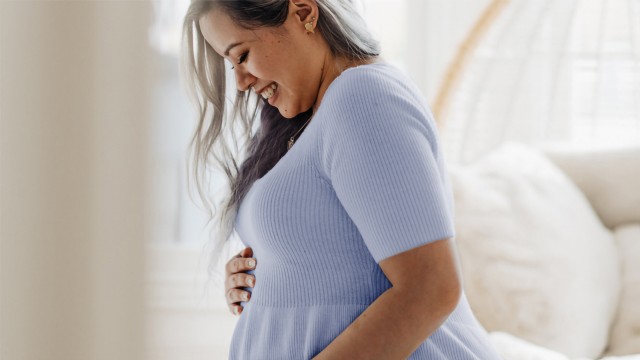 the mother moves the hand over the belly,