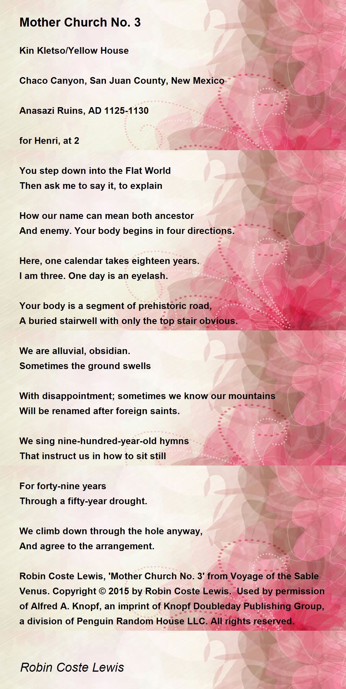 Robin Coste Lewis, 'Mother Church No. 3' from Voyage of the Sable Venus. Copyright © 2015 by Robin Coste Lewis. Used by permission of Alfred A. Knopf, an imprint of Knopf Doubleday Publishing Group, a division of Penguin Random House LLC. All rights reserved.