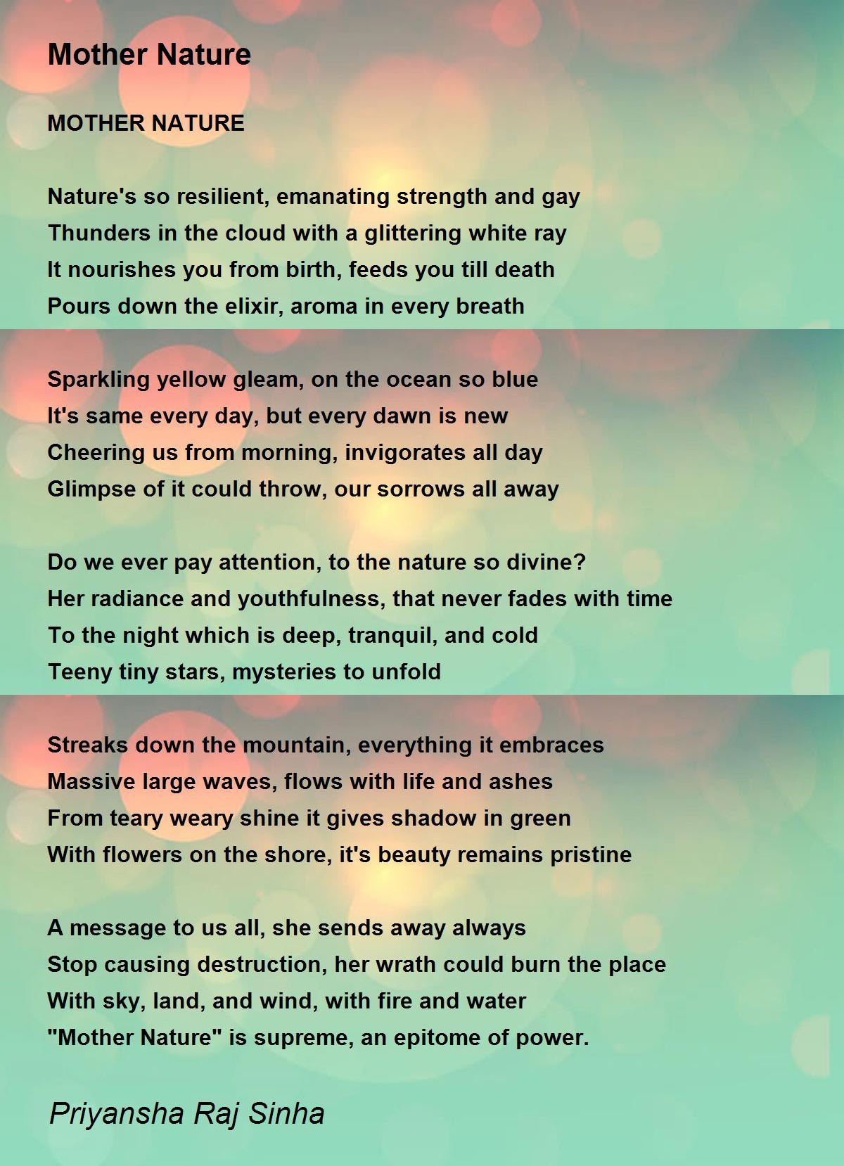 The important warning signal gives by the poet against destroying the nature. good poem and likes.