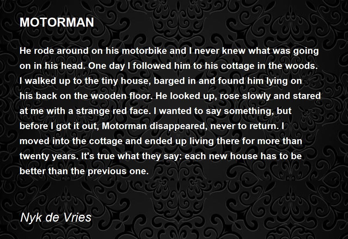He rode around on his motorbike and I never knew what was going on in his head. One day I followed him to his cottage in the woods. I walked up to the tiny house, barged in and found him lying on his back on the wooden floor. He looked up, rose slowly and stared at me with a strange red face. I wanted to say something, but before I got it out, Motorman disappeared, never to return. I moved into the cottage and ended up living there for more than twenty years. It's true what they say: each new house has to be better than the previous one.