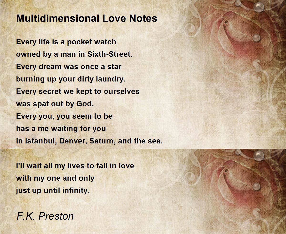 MULTIDIMENSIONAL LOVE NOTES is a truly excellent poem with tinge of surrealistic tone, but a brilliant verse, well conveyed and best presented. The picture added is true surrealistic and beautiful painting. I can tell you, since I am also a paintress. I like this poem very much. CONGRATULATIONS on being chosen as The Member Poem Of The Day. Hooray! A 10 ++++++for the dashing poem.
