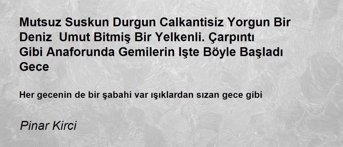 Mutsuz Suskun Durgun Calkantisiz Yorgun Bir Deniz Umut Bitmiş Bir Yelkenli. Çarpıntı Gibi Anaforunda Gemilerin Işte Böyle Başladı Gece Poem by Pinar Kirci
