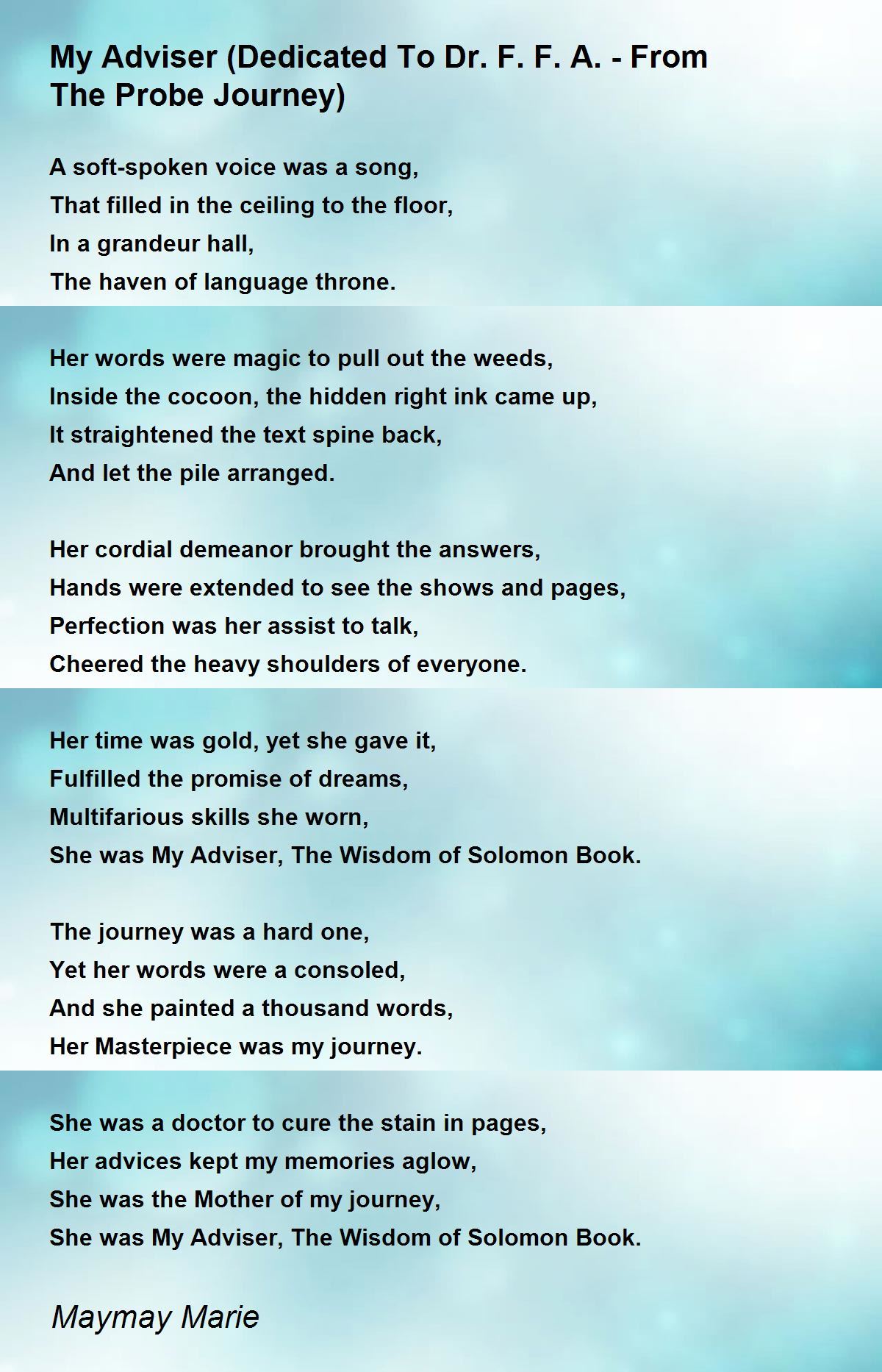 She was My Adviser, The Wisdom of Solomon Book.