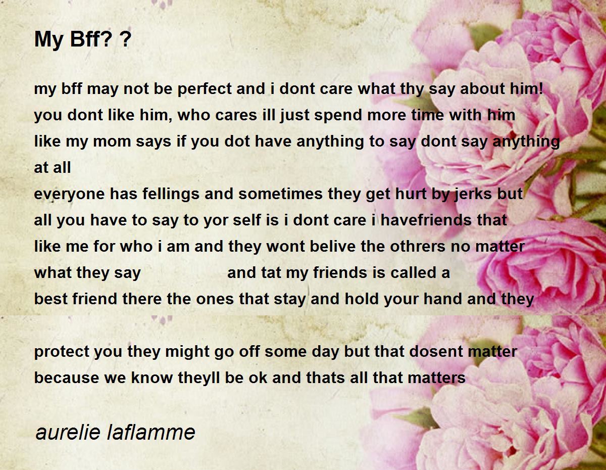 my bff may not be perfect and i dont care what thy say about him! you dont like him, who cares ill just spend more time with him like my mom says if you dot have anything to say dont say anything at all everyone has fellings and sometimes they get hurt by jerks but all you have to say to yor self is i dont care i havefriends that like me for who i am and they wont belive the othrers no matter what they say and tat my friends is called a best friend there the ones that stay and hold your hand and they protect you they might go off some day but that dosent matter because we know theyll be ok and thats all that matters