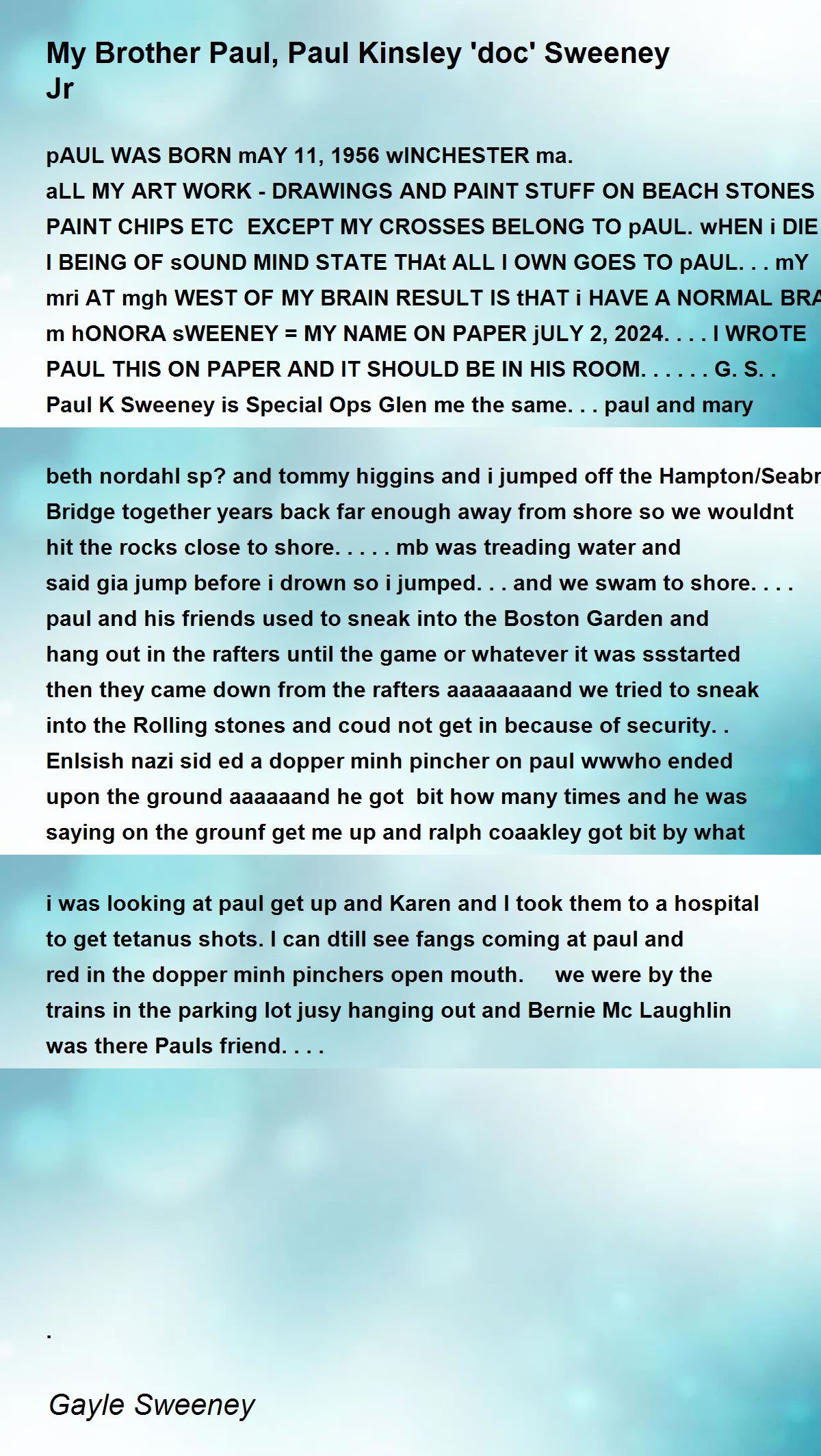 pAUL WAS BORN mAY 11,1956 wINCHESTER ma. aLL MY ART WORK - DRAWINGS AND PAINT STUFF ON BEACH STONES AND PAINT CHIPS ETC EXCEPT MY CROSSES BELONG TO pAUL. wHEN i DIE I BEING OF sOUND MIND STATE THAt ALL I OWN GOES TO pAUL... mY mri AT mgh WEST OF MY BRAIN RESULT IS tHAT i HAVE A NORMAL BRAIN....gAYLE m hONORA sWEENEY = MY NAME ON PAPER jULY 2,2024....I WROTE PAUL THIS ON PAPER AND IT SHOULD BE IN HIS ROOM......G.S.. Paul K Sweeney is Special Ops Glen me the same...paul and mary beth nordahl sp? and tommy higgins and i jumped off the Hampton/Seabrook Bridge together years back far enough away from shore so we wouldnt hit the rocks close to shore.....mb was treading water and said gia jump before i drown so i jumped... and we swam to shore....