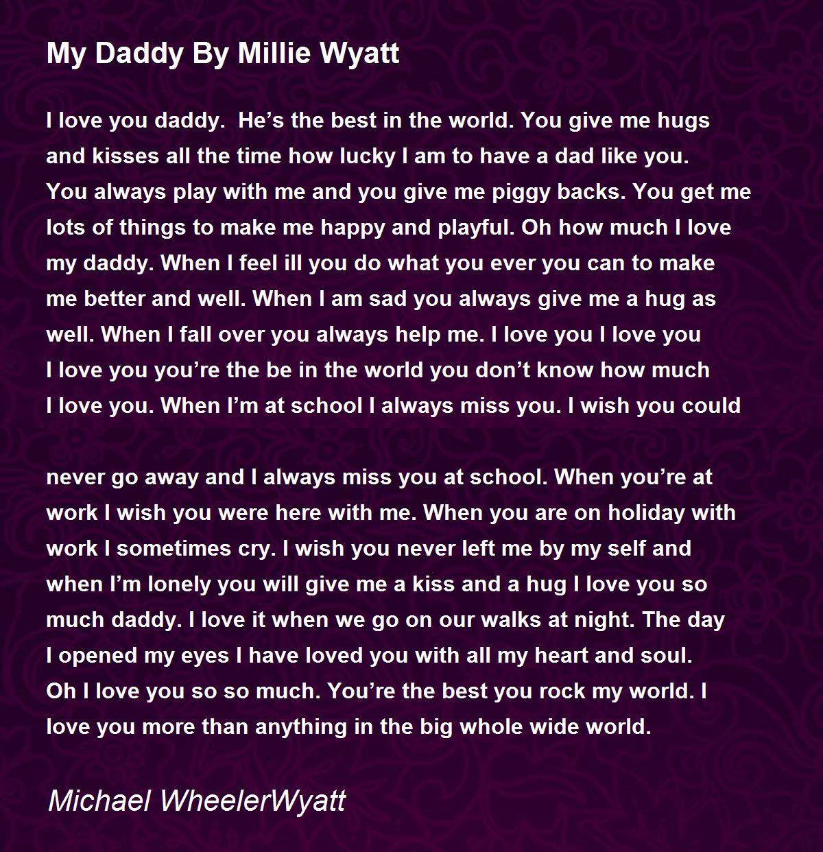 I love you daddy. He’s the best in the world. You give me hugs and kisses all the time how lucky I am to have a dad like you. You always play with me and you give me piggy backs. You get me lots of things to make me happy and playful. Oh how much I love my daddy. When I feel ill you do what you ever you can to make me better and well. When I am sad you always give me a hug as well. When I fall over you always help me. I love you I love you I love you you’re the be in the world you don’t know how much I love you. When I’m at school I always miss you. I wish you could never go away and I always miss you at school. When you’re at work I wish you were here with me. When you are on holiday with work I sometimes cry. I wish you never left me by my self and when I’m lonely you will give me a kiss and a hug I love you so much daddy. I love it when we go on our walks at night. The day I opened my eyes I have loved you with all my heart and soul. Oh I love you so so much. You’re the best you rock my world. I love you more than anything in the big whole wide world.