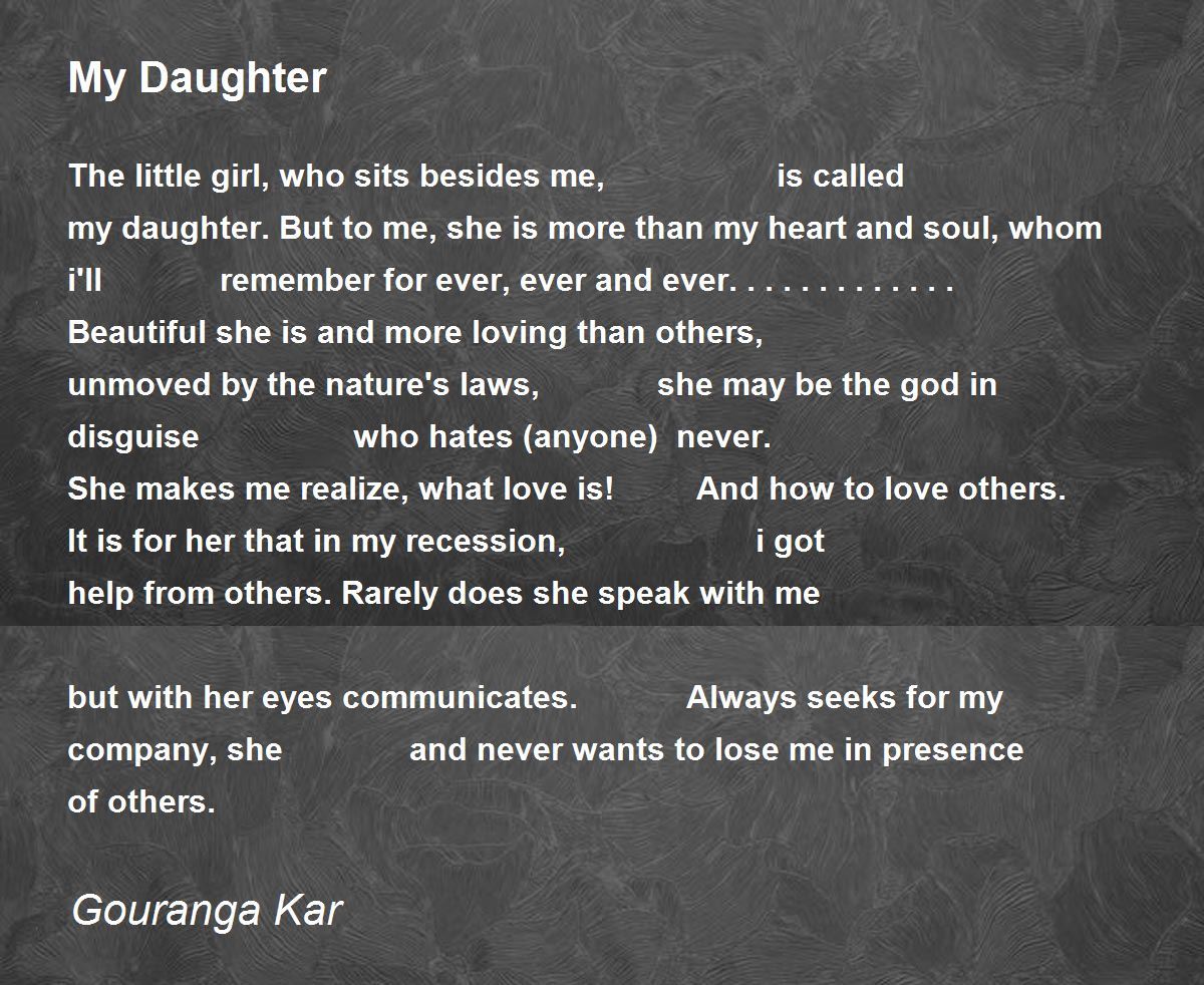 The little girl, who sits besides me, is called my daughter. But to me, she is more than my heart and soul, whom i'll remember for ever, ever and ever............. Beautiful she is and more loving than others, unmoved by the nature's laws, she may be the god in disguise who hates (anyone) never. She makes me realize, what love is! And how to love others. It is for her that in my recession, i got help from others. Rarely does she speak with me but with her eyes communicates. Always seeks for my company, she and never wants to lose me in presence of others.