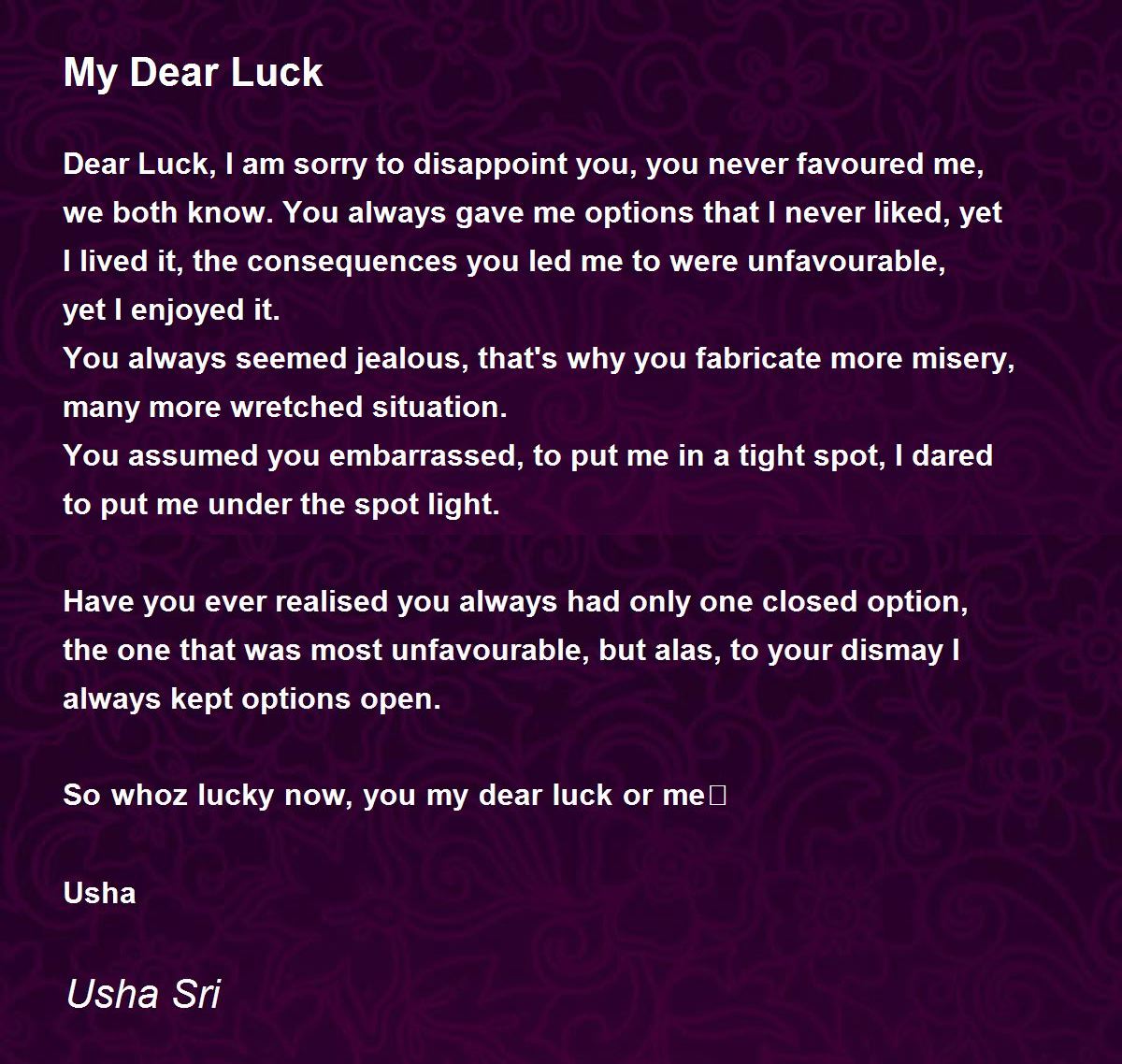 Dear Luck, I am sorry to disappoint you, you never favoured me, we both know. You always gave me options that I never liked, yet I lived it, the consequences you led me to were unfavourable, yet I enjoyed it.