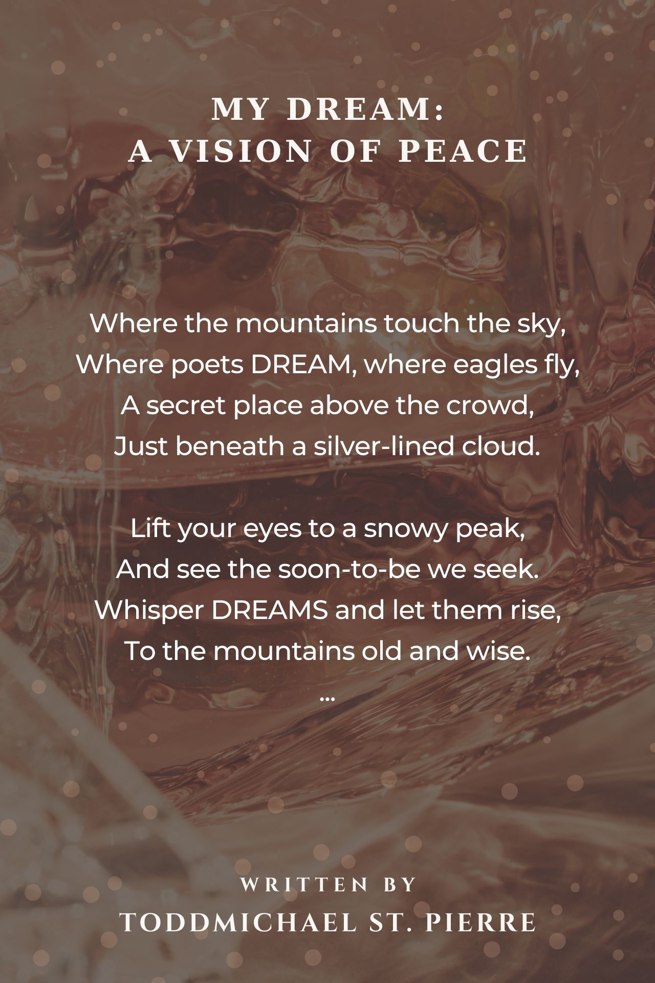 I really liked your poem. Peace is something that is hard to attain in this world. I enjoyed it because peace should be something people everywhere can have and yet so many people I have met have refused to find peace within themselves. Your dream of peace is a dream that I understand and i appreciate.