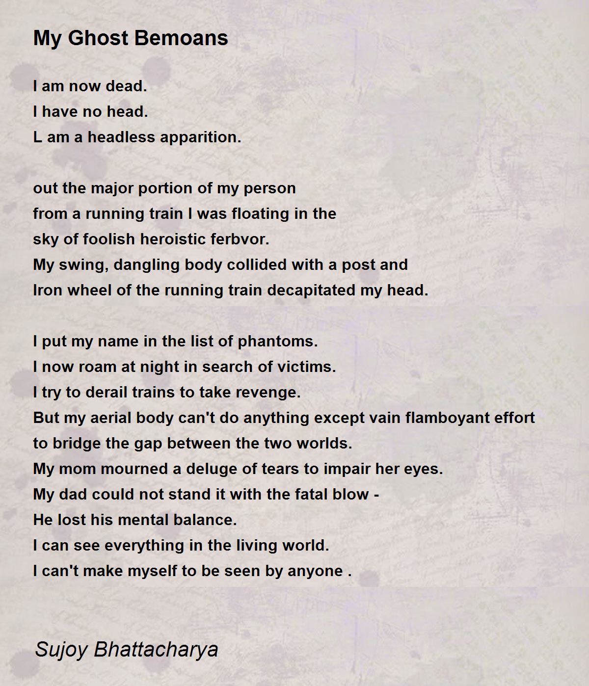 A beautiful narration on ghost has been made in this poem. How a person was decapitated by a running train infront of his parent has been depicted heartfeltly by you dear Sujoy. After death he became an apparition and had an aerial body which was not seen to them. As a phantom he saw his mother's mourning and father's mental imbalance but he can't make himself to be seen by them. The title of the poem is appropriated. Thank u dear Sujoy for sharing.