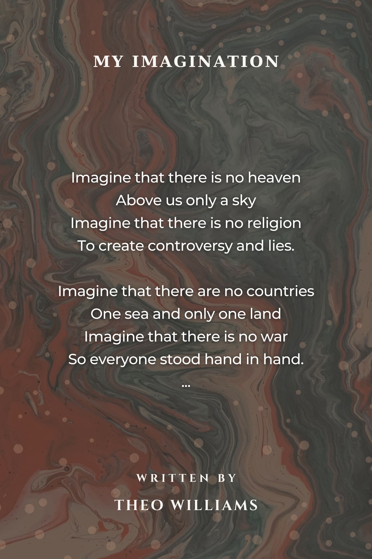 I share the same dream my friend! VERY WELL WRITTEN poem AGAIN Theo! I honestly love you work and your poems! You are a tremendous poet whom sees the world for what it really is. I have read all of your poems and they are just soo powerful and meaningful. Alot of meaning behind your work and I simply love it. Imagine that there are no countries One sea and only one land Imagine that there is no war So everyone stood hand in hand These are my favourite lines in this poem because they really felt powerful to me and really engaged me to the beautiful imagination you possess. Very creative Theo please keep your poems coming. Much love.