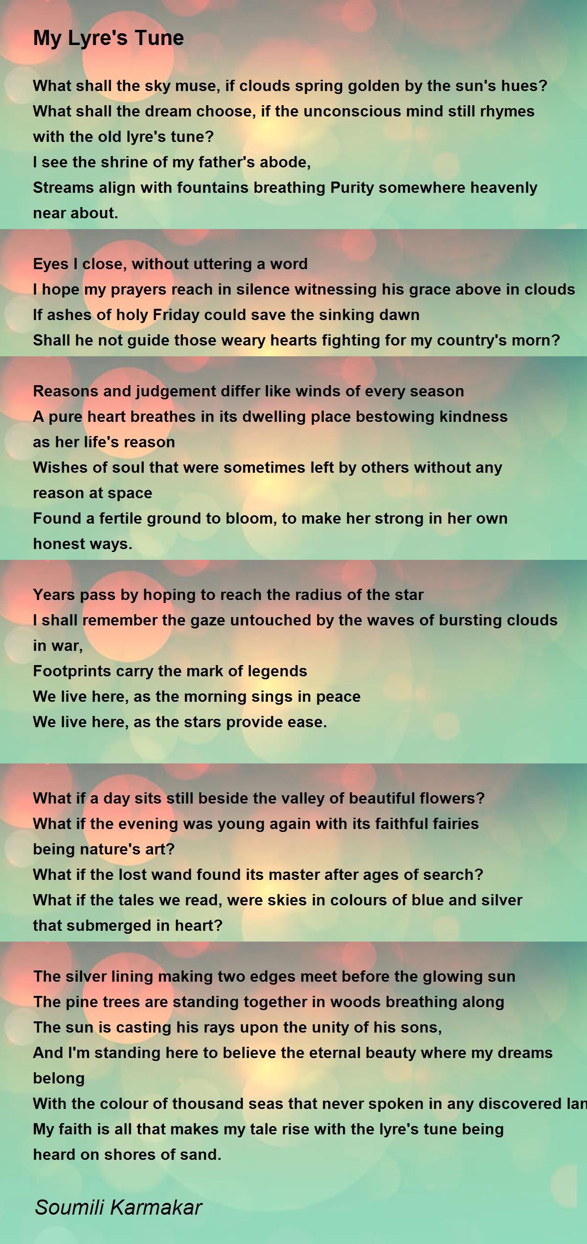 My faith is all that makes my tale rise with the lyre's tune being heard on shores of sand.