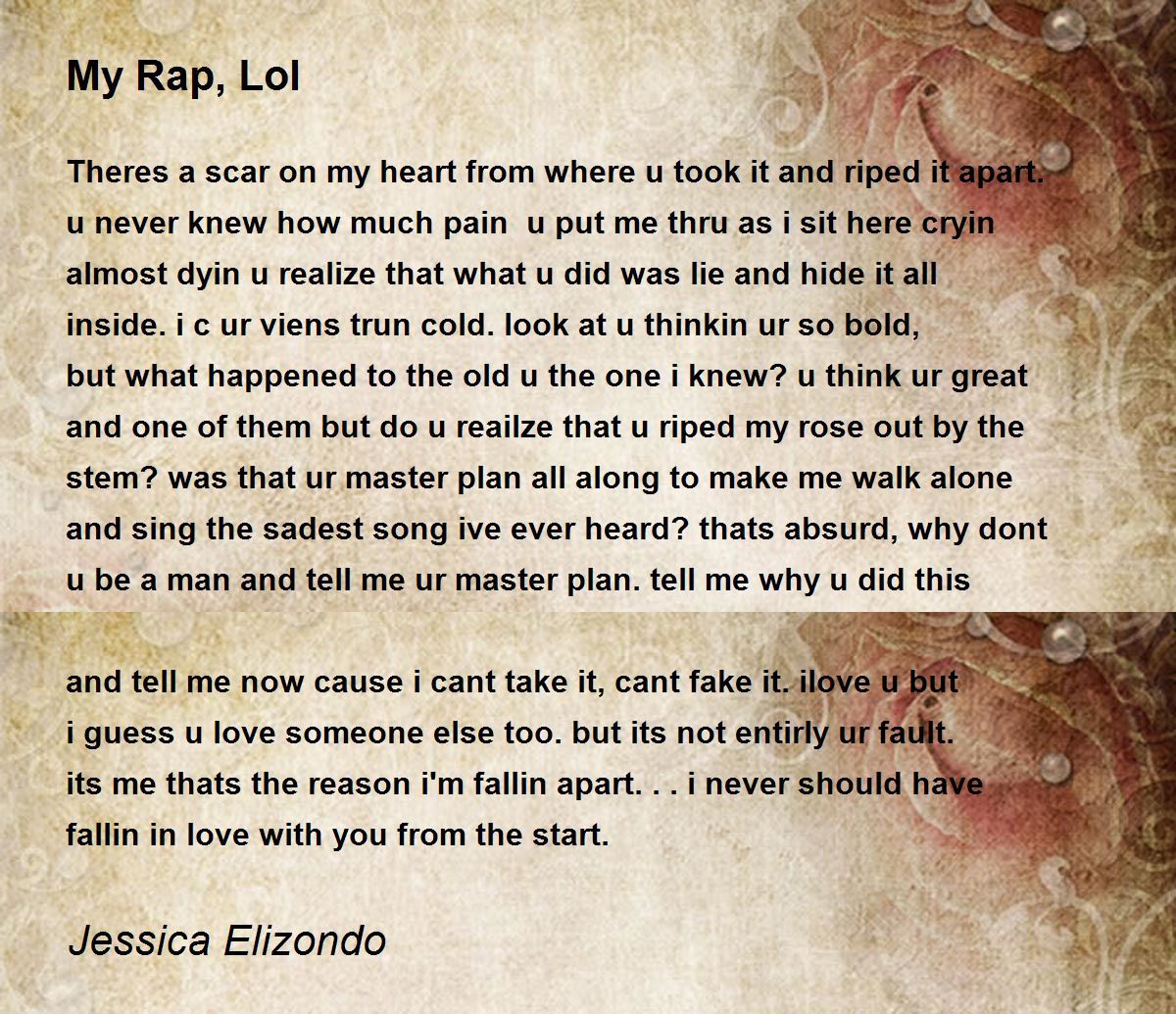 Theres a scar on my heart from where u took it and riped it apart. u never knew how much pain u put me thru as i sit here cryin almost dyin u realize that what u did was lie and hide it all inside. i c ur viens trun cold. look at u thinkin ur so bold, but what happened to the old u the one i knew? u think ur great and one of them but do u reailze that u riped my rose out by the stem? was that ur master plan all along to make me walk alone and sing the sadest song ive ever heard? thats absurd, why dont u be a man and tell me ur master plan. tell me why u did this and tell me now cause i cant take it, cant fake it. ilove u but i guess u love someone else too. but its not entirly ur fault. its me thats the reason i'm fallin apart...i never should have fallin in love with you from the start.