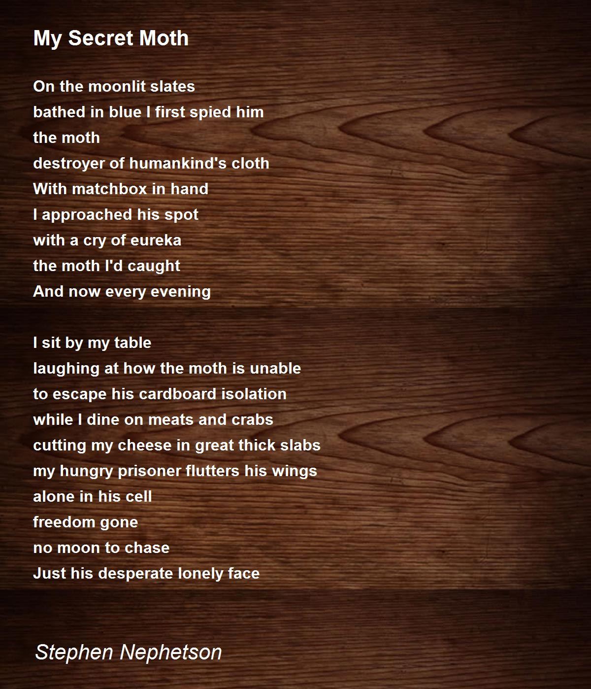 while I dine on meats and crabs cutting my cheese in great thick slabs my hungry prisoner flutters his wings alone in his cell freedom gone no moon to chase Just his desperate lonely face.. beautiful. it came as a meditation... how the faculty of thought can create wonderful poems. thank you very much. tony