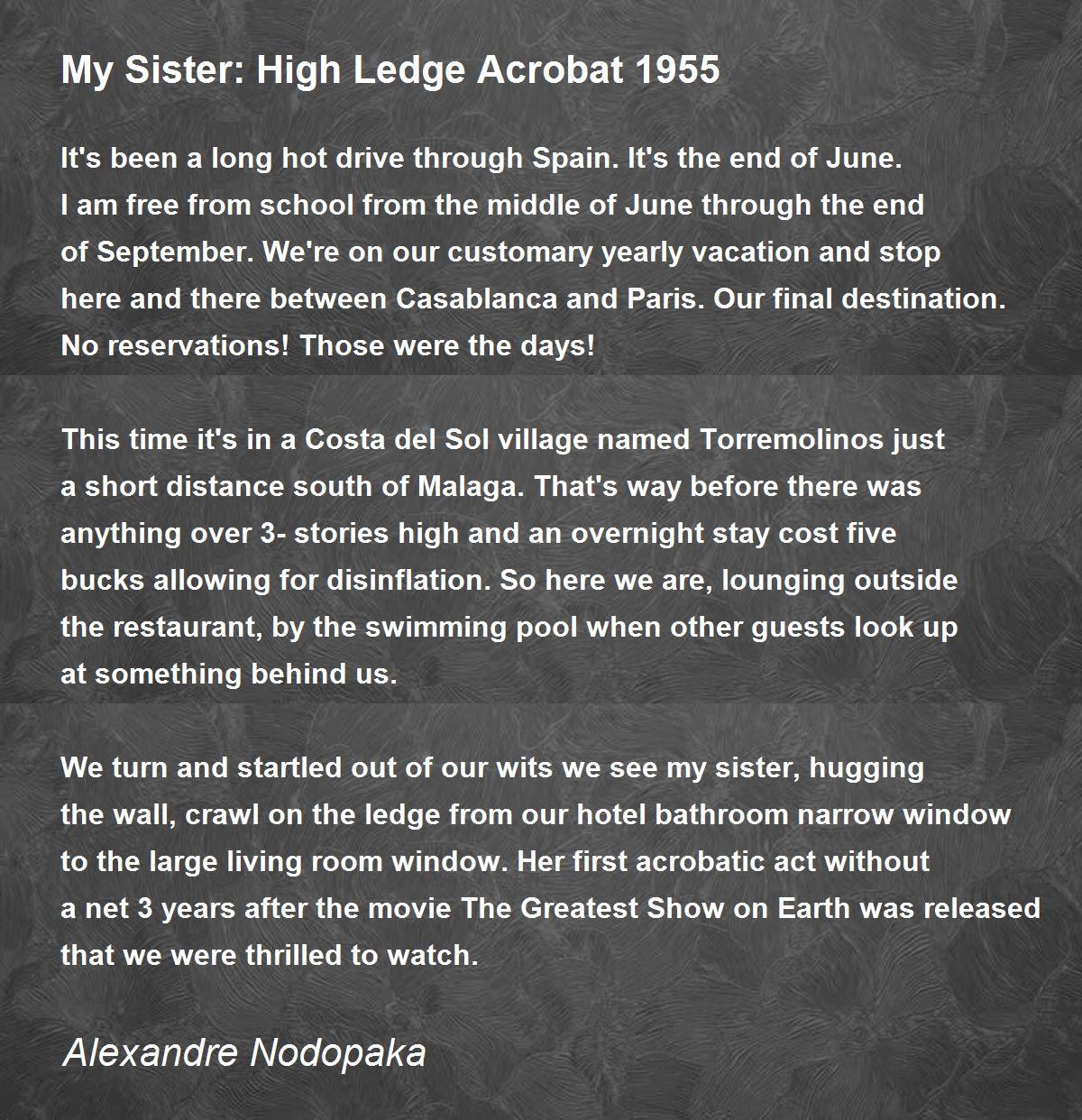 We turn and startled out of our wits we see my sister, hugging the wall, crawl on the ledge from our hotel bathroom narrow window to the large living room window. Her first acrobatic act without a net 3 years after the movie The Greatest Show on Earth was released that we were thrilled to watch.