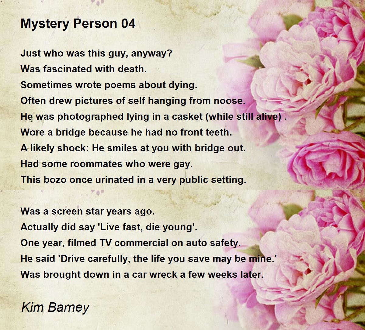 How in the world did you ever come up with that response? You are absolutely correct! I gave some little-known facts about a well-known person. Congratulations! If nobody had solved this by the end of the month, I was going to use this poem as the November Contest. Now I have to come up with something else. By, the way, nobody has yet solved the October 2016 contest. See the poem 'Mystery Creatures'. Anybody who could solve this one should also be able to solve that one.