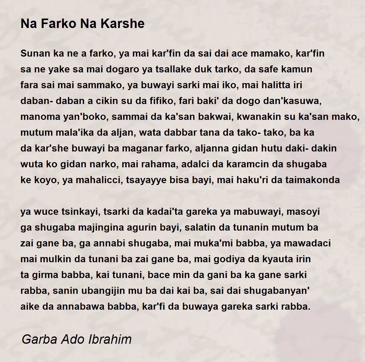 Sunan ka ne a farko, ya mai kar'fin da sai dai ace mamako, kar'fin sa ne yake sa mai dogaro ya tsallake duk tarko, da safe kamun fara sai mai sammako, ya buwayi sarki mai iko, mai halitta iri daban-daban a cikin su da fifiko, fari baki' da dogo dan'kasuwa, manoma yan'boko, sammai da ka'san bakwai, kwanakin su ka'san mako, mutum mala'ika da aljan, wata dabbar tana da tako-tako, ba ka da kar'she buwayi ba maganar farko, aljanna gidan hutu daki-dakin wuta ko gidan narko, mai rahama, adalci da karamcin da shugaba ke koyo, ya mahalicci, tsayayye bisa bayi, mai haku'ri da taimakonda ya wuce tsinkayi, tsarki da kadai'ta gareka ya mabuwayi, masoyi ga shugaba majingina agurin bayi, salatin da tunanin mutum ba zai gane ba, ga annabi shugaba, mai muka'mi babba, ya mawadaci mai mulkin da tunani ba zai gane ba, mai godiya da kyauta irin ta girma babba, kai tunani, bace min da gani ba ka gane sarki rabba, sanin ubangijin mu ba dai kai ba, sai dai shugabanyan' aike da annabawa babba, kar'fi da buwaya gareka sarki rabba.