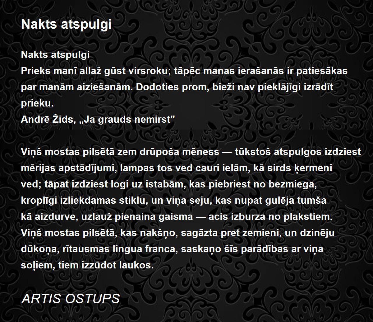 Viņš mostas pilsētā zem drūpoša mēness — tūkstoš atspulgos izdziest mērijas apstādījumi, lampas tos ved cauri ielām, kā sirds ķermeni ved; tāpat izdziest logi uz istabām, kas piebriest no bezmiega, kroplīgi izliekdamas stiklu, un viņa seju, kas nupat gulēja tumša kā aizdurve, uzlauž pienaina gaisma — acis izburza no plakstiem. Viņš mostas pilsētā, kas nakšņo, sagāzta pret zemieni, un dzinēju dūkoņa, rītausmas lingua franca, saskaņo šīs parādības ar viņa soļiem, tiem izzūdot laukos.