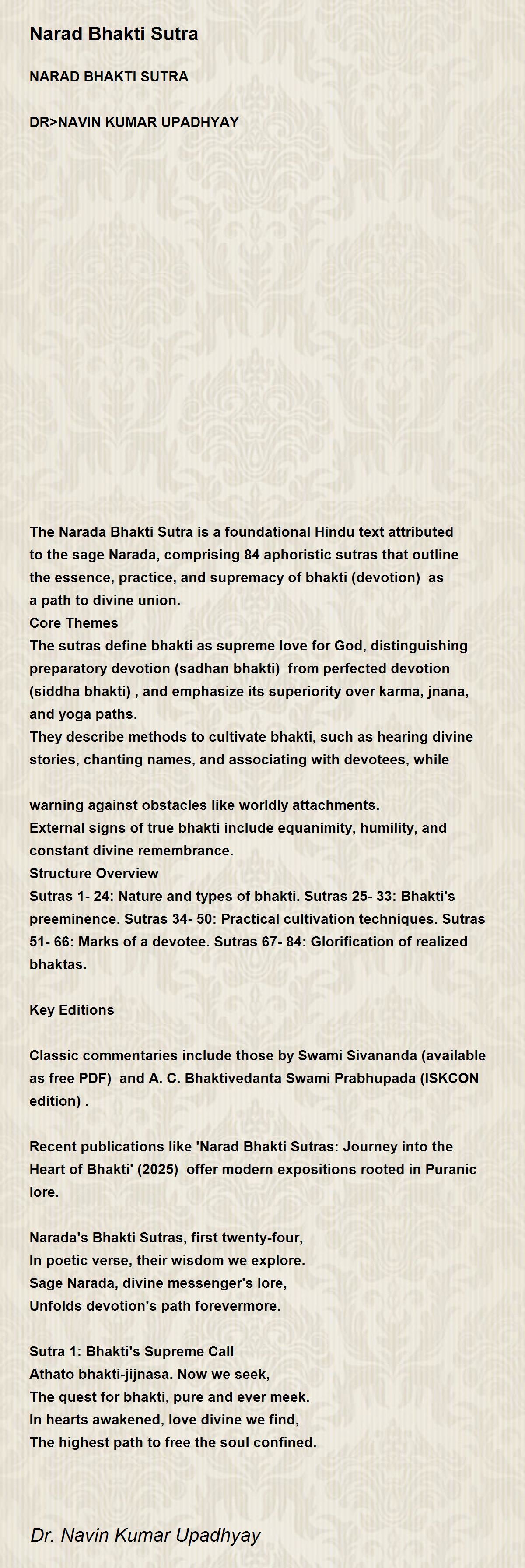 The Narada Bhakti Sutra is a foundational Hindu text attributed to the sage Narada, comprising 84 aphoristic sutras that outline the essence, practice, and supremacy of bhakti (devotion) as a path to divine union.