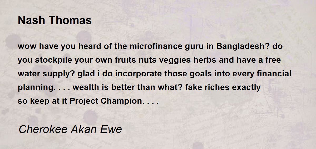 wow have you heard of the microfinance guru in Bangladesh? do you stockpile your own fruits nuts veggies herbs and have a free water supply? glad i do incorporate those goals into every financial planning....wealth is better than what? fake riches exactly so keep at it Project Champion....
