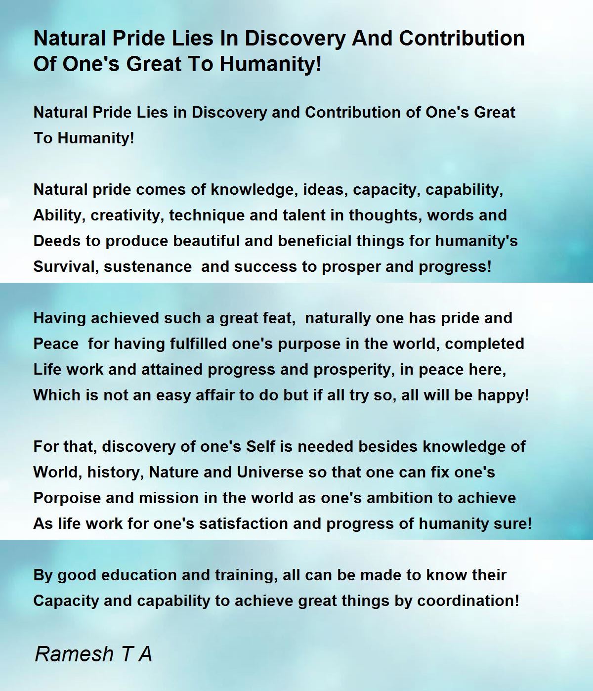 Natural Pride Lies in Discovery and Contribution of One's Great To Humanity!