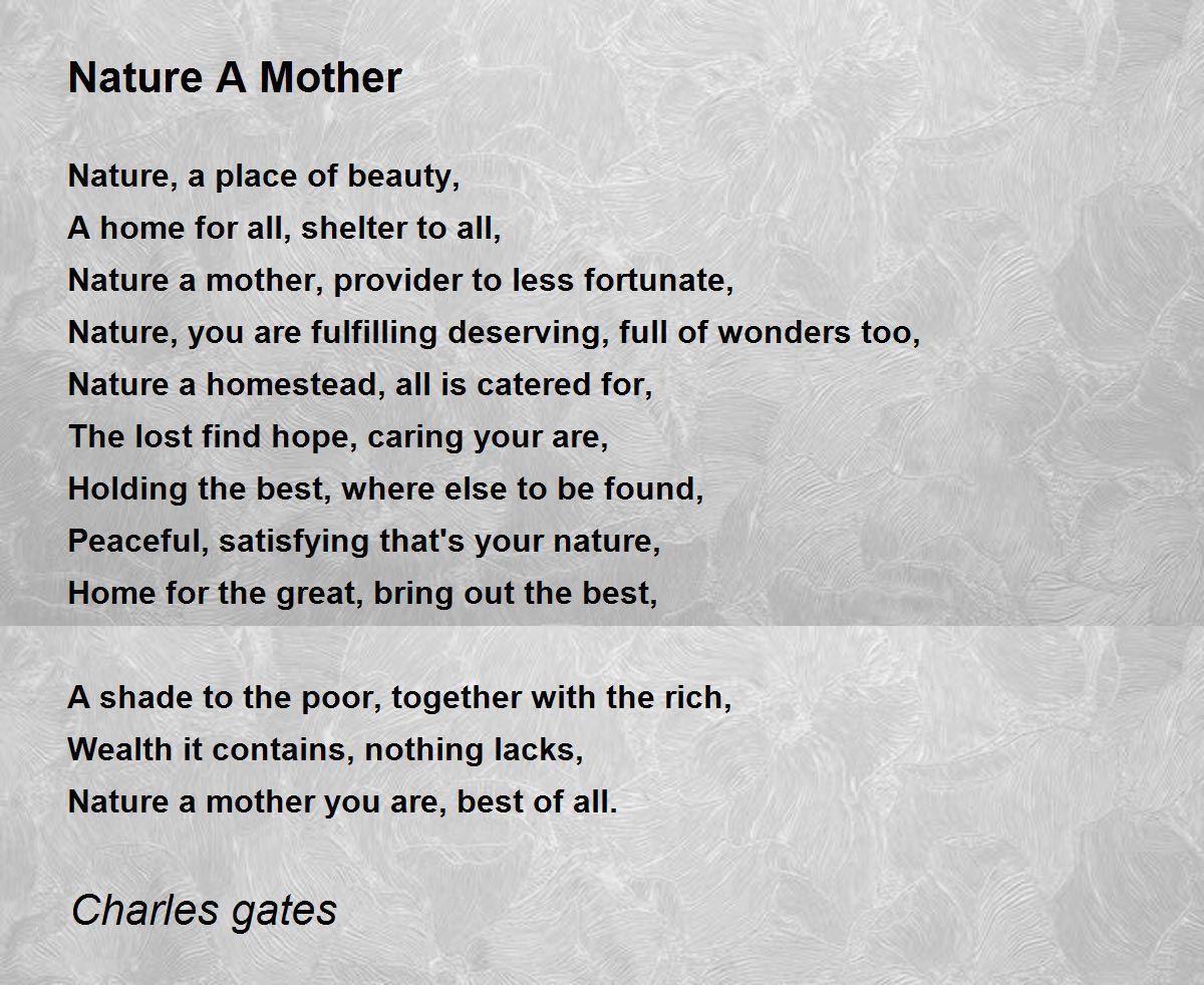 Nature is beautiful home for all and this is nice shelter. Nature is a beautiful place and nature is our mother. Nature is the best. She has preserved many more resources for us. Brilliant and beautiful poem is shared here...rating 10. Welcome to Poem Hunter.