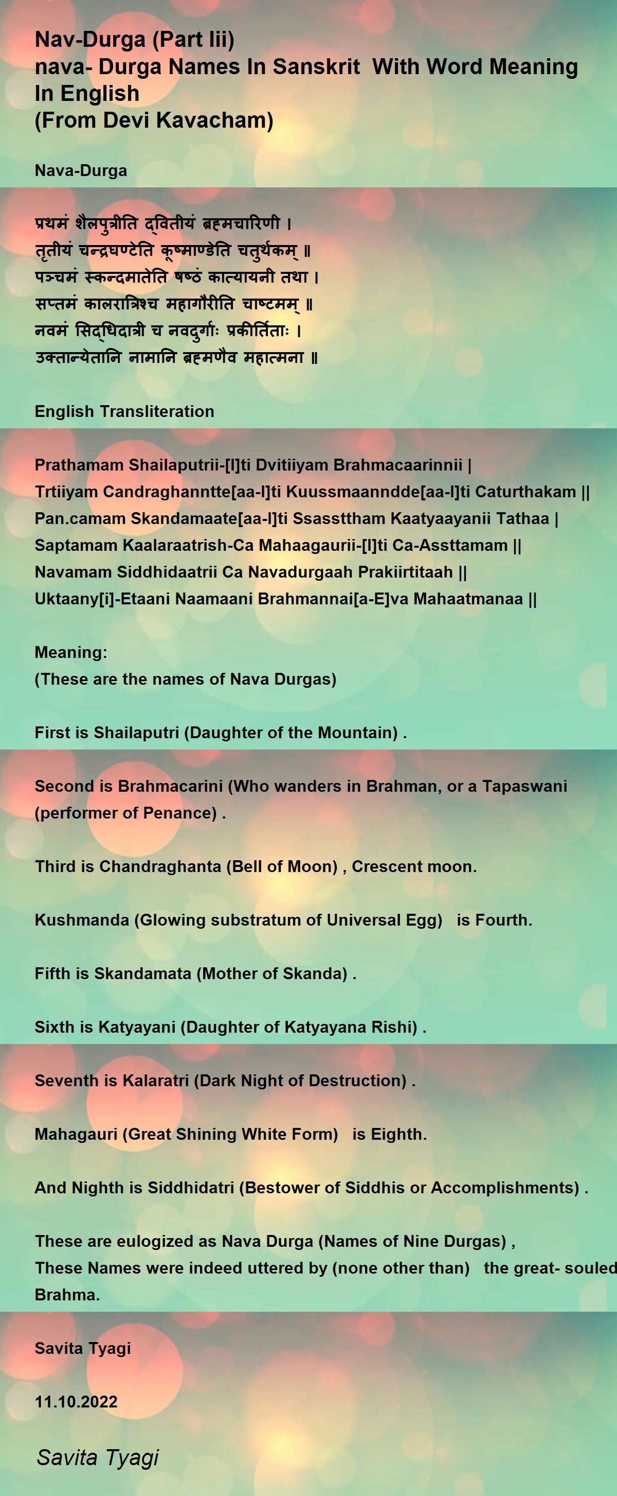 Thank you so much Dr. Swain. I hope you read the second poem of the series where i have given some different interpretations for some of the names as it dawned upon me while reading the Devi Mahatamyam.