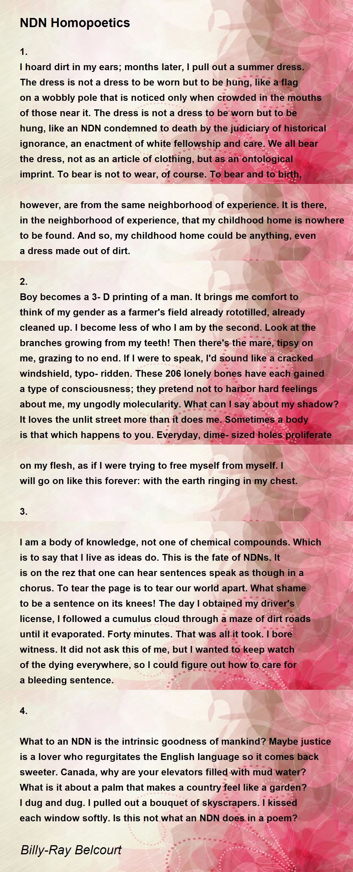 What to an NDN is the intrinsic goodness of mankind? Maybe justice is a lover who regurgitates the English language so it comes back sweeter. Canada, why are your elevators filled with mud water? What is it about a palm that makes a country feel like a garden? I dug and dug. I pulled out a bouquet of skyscrapers. I kissed each window softly. Is this not what an NDN does in a poem?