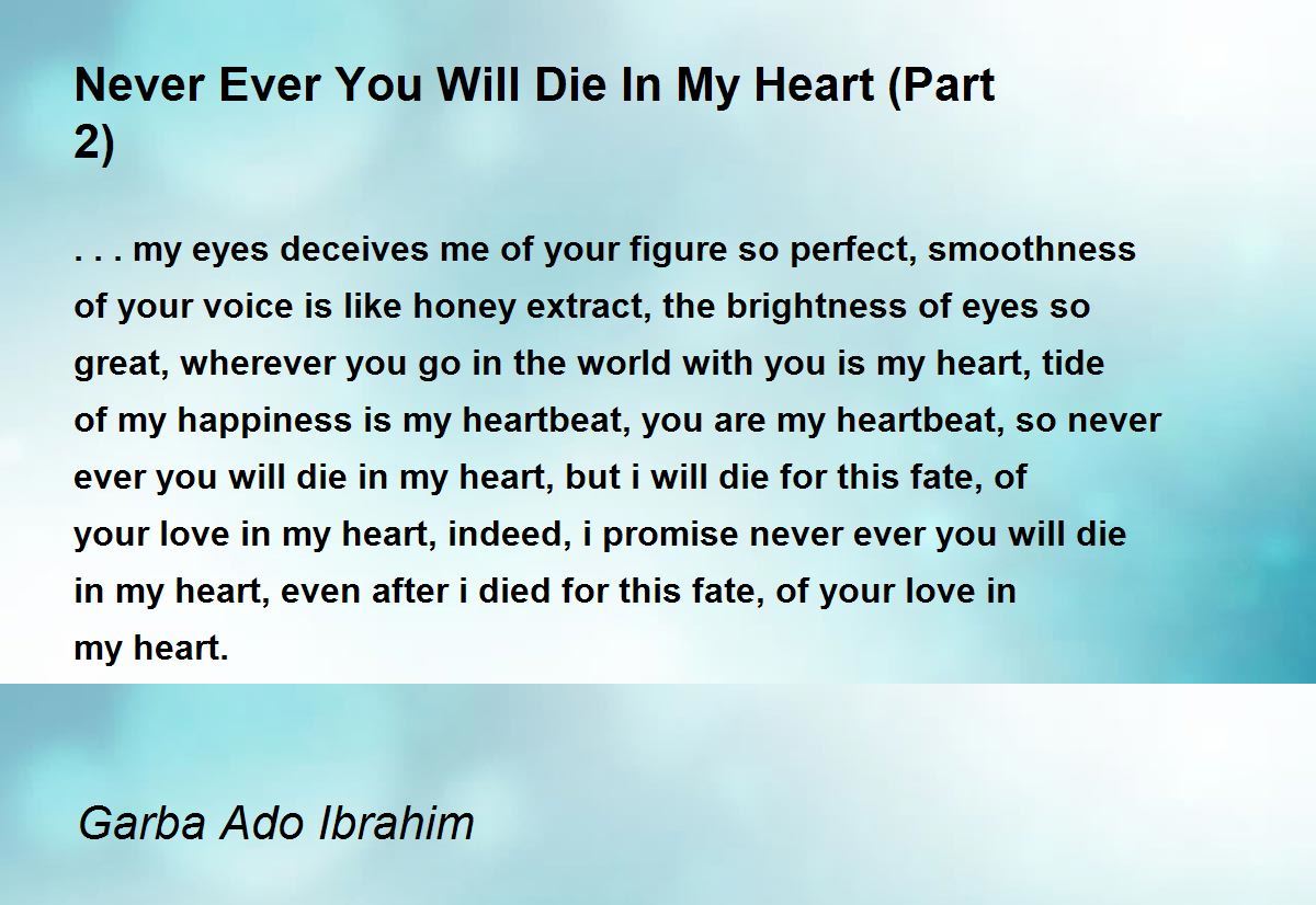 ...my eyes deceives me of your figure so perfect, smoothness of your voice is like honey extract, the brightness of eyes so great, wherever you go in the world with you is my heart, tide of my happiness is my heartbeat, you are my heartbeat, so never ever you will die in my heart, but i will die for this fate, of your love in my heart, indeed, i promise never ever you will die in my heart, even after i died for this fate, of your love in my heart.