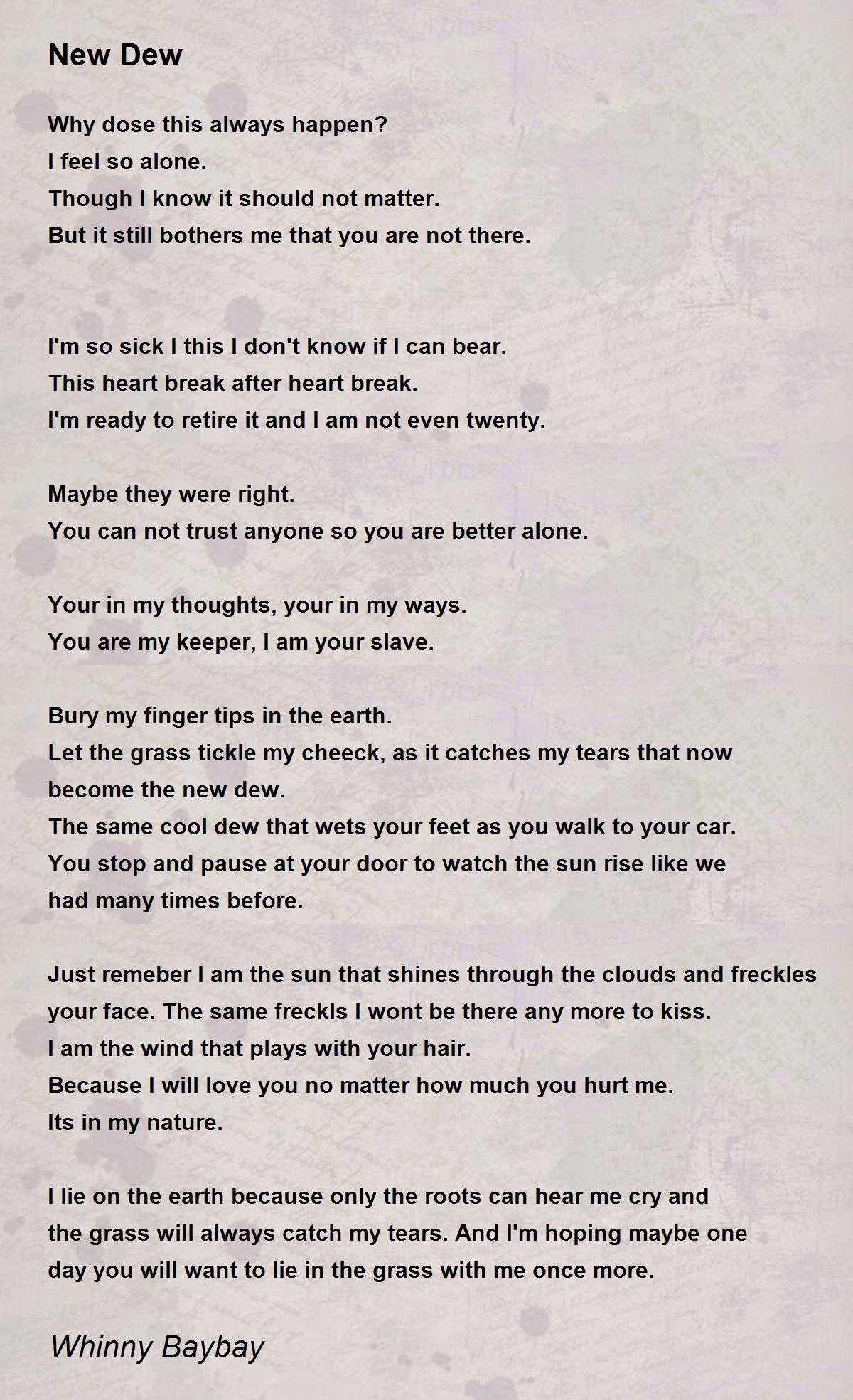 Let the grass tickle my cheeck, as it catches my tears that now become the new dew.