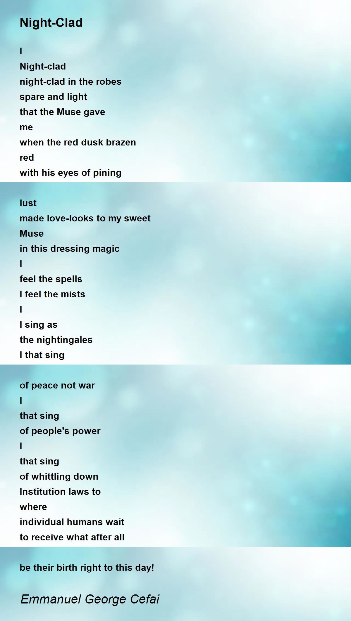 WOW! It's as if YOU are the Poet-Seer in this poem! But no, you are a poet blessed by the Muse to play the role of a kind of mystagogue, replete with a ceremonial robe, and your role is truly a grand and necessary one. It is one of restoring things to their proper places, to making a spiritual system operate the way it should. I count four tasks you fulfill in your mystagogue mission 1) you SING AS NIGHTINGALES DO. (John Keats is smiling in heaven!) 2) You sing of peace not war. Poetry will NOT serve the warlords' violent purpose.3) Your SONG, your poetry grants power to the people 4) Your poetry refines, even reduces the coercive power of the LAW so that it serves the people's needs. This is a grand poem addressing the social/societal roles of the Poet and the Poem! It is a necessary poem and you have fulfilled that necessity. The Way is set for other poets to follow, as they too put on the Muse's robe/mantle.