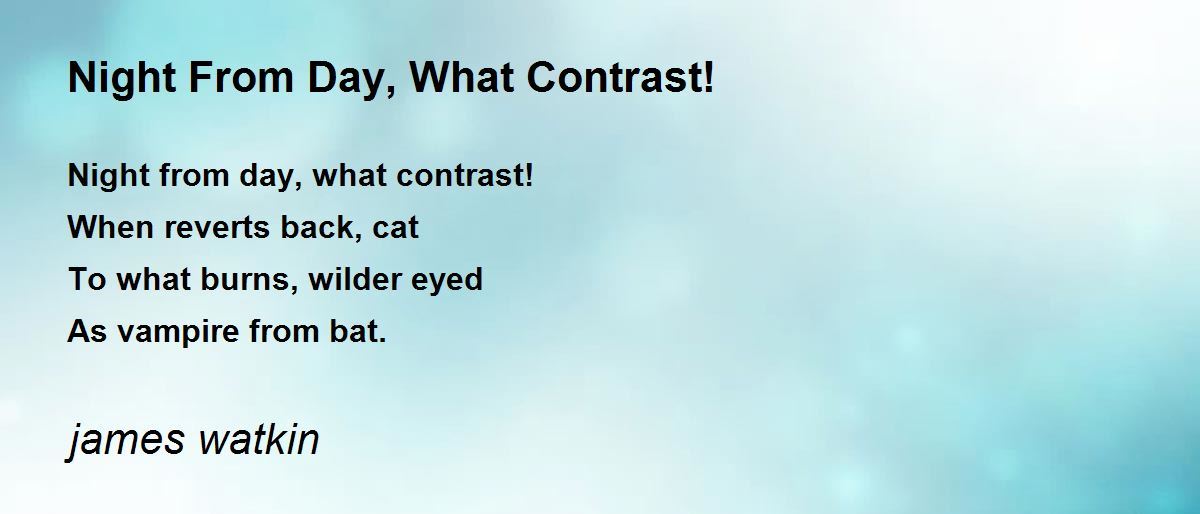 Night from day, what contrast! When reverts back, catTo what burns, wilder eyedAs vampire from bat.