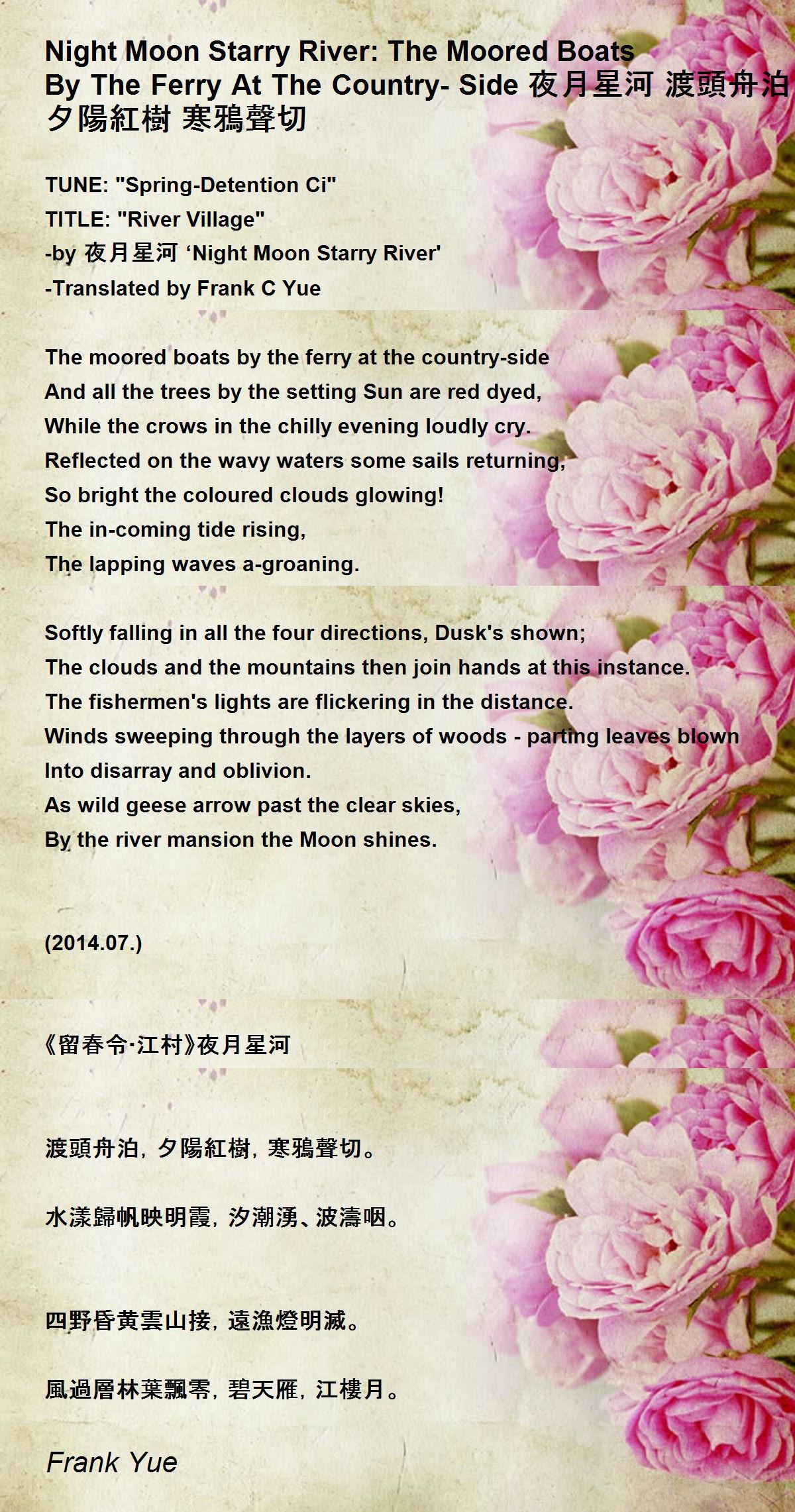 渡頭舟泊,夕陽紅樹,寒鴉聲切。