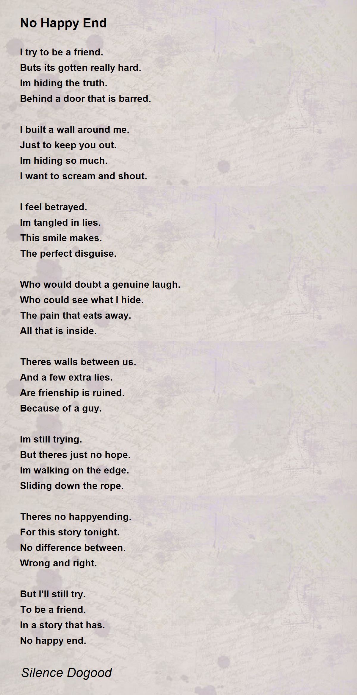 there is not always a happy ending to every story. i think this should have ended at the lines No difference between. Wrong and right. but that is just me.this holds a message not everyone knows.... you are very wise. good job. Becca