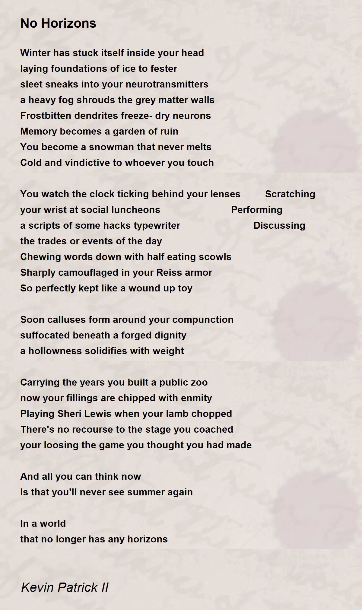 Winter has stuck itself inside your head laying foundations of ice to fester sleet sneaks into your neurotransmitters a heavy fog shrouds the grey matter walls Frostbitten dendrites freeze-dry neurons Memory becomes a garden of ruin You become a snowman that never melts Cold and vindictive to whoever you touch