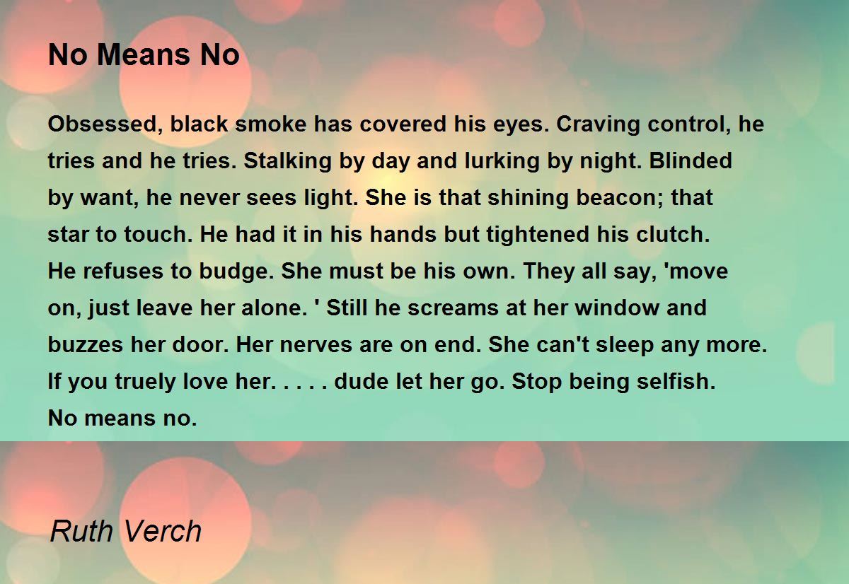 Obsessed, black smoke has covered his eyes. Craving control, he tries and he tries. Stalking by day and lurking by night. Blinded by want, he never sees light. She is that shining beacon; that star to touch. He had it in his hands but tightened his clutch. He refuses to budge. She must be his own. They all say, 'move on, just leave her alone.' Still he screams at her window and buzzes her door. Her nerves are on end. She can't sleep any more. If you truely love her.....dude let her go. Stop being selfish. No means no.