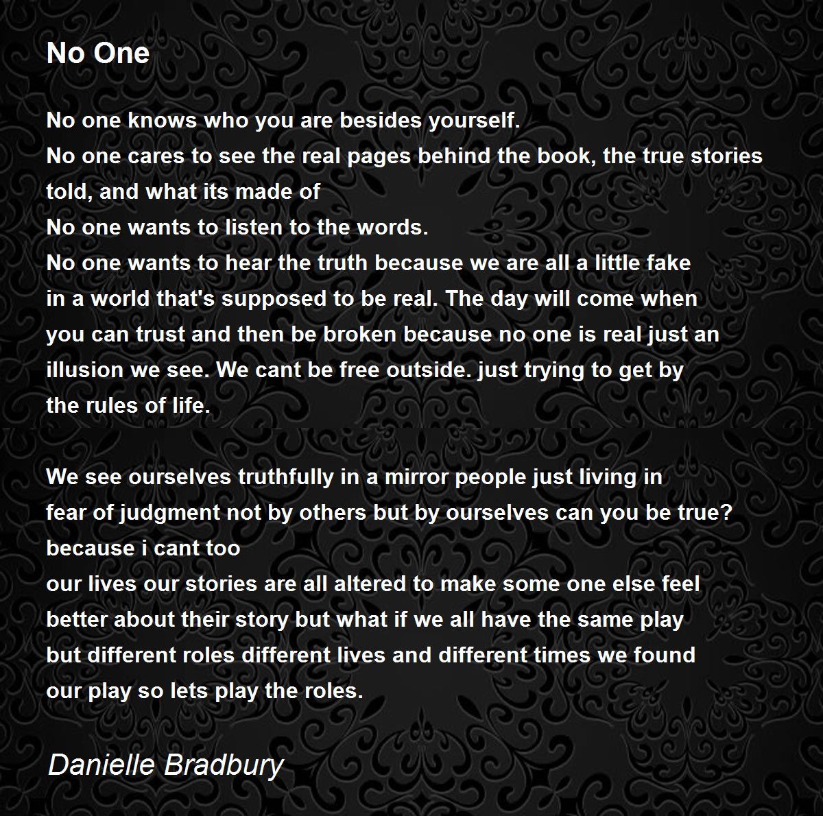 No one wants to hear the truth because we are all a little fake in a world that's supposed to be real. The day will come when you can trust and then be broken because no one is real just an illusion we see. We cant be free outside. just trying to get by the rules of life.