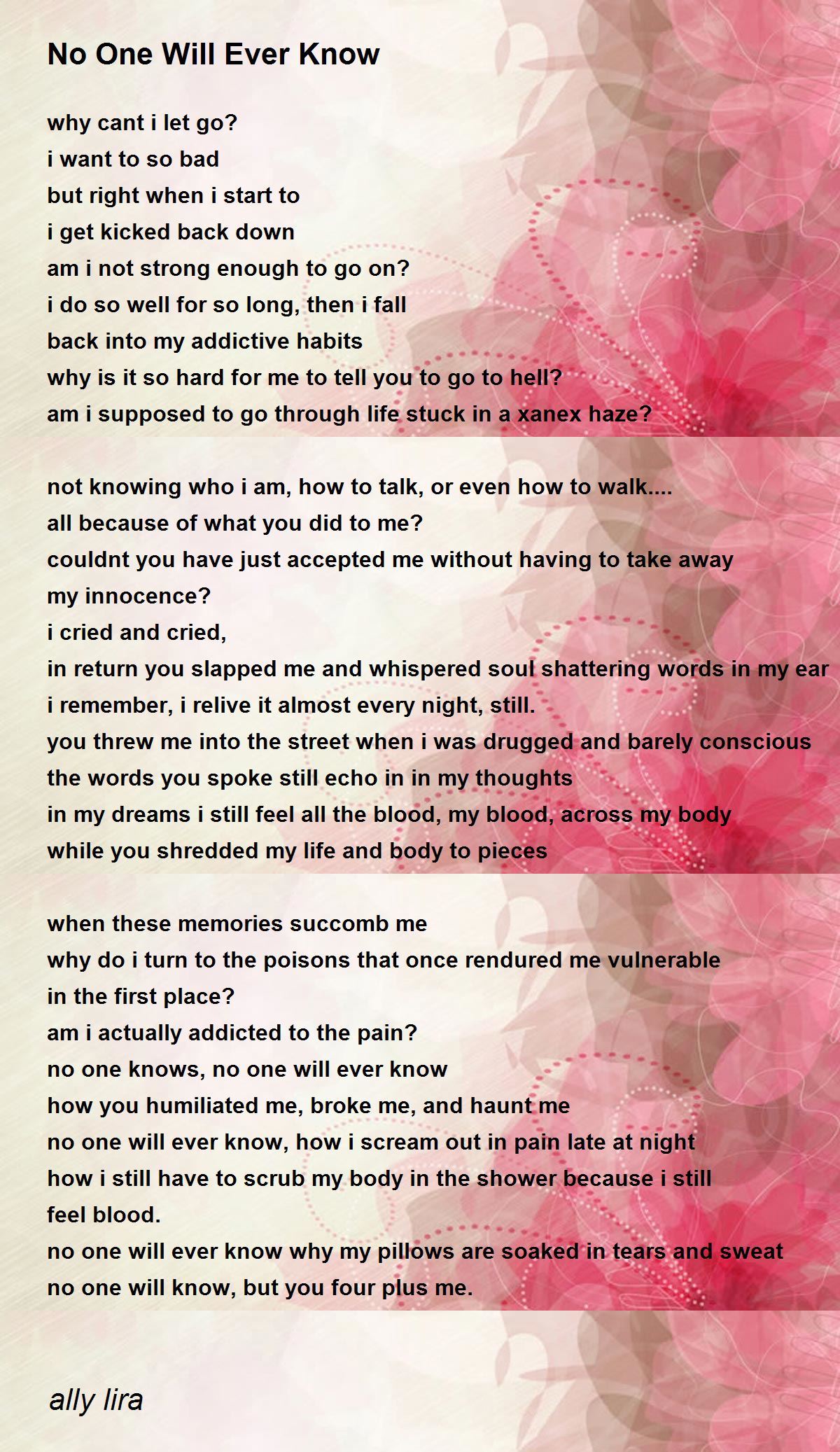 no one will ever know, how i scream out in pain late at night