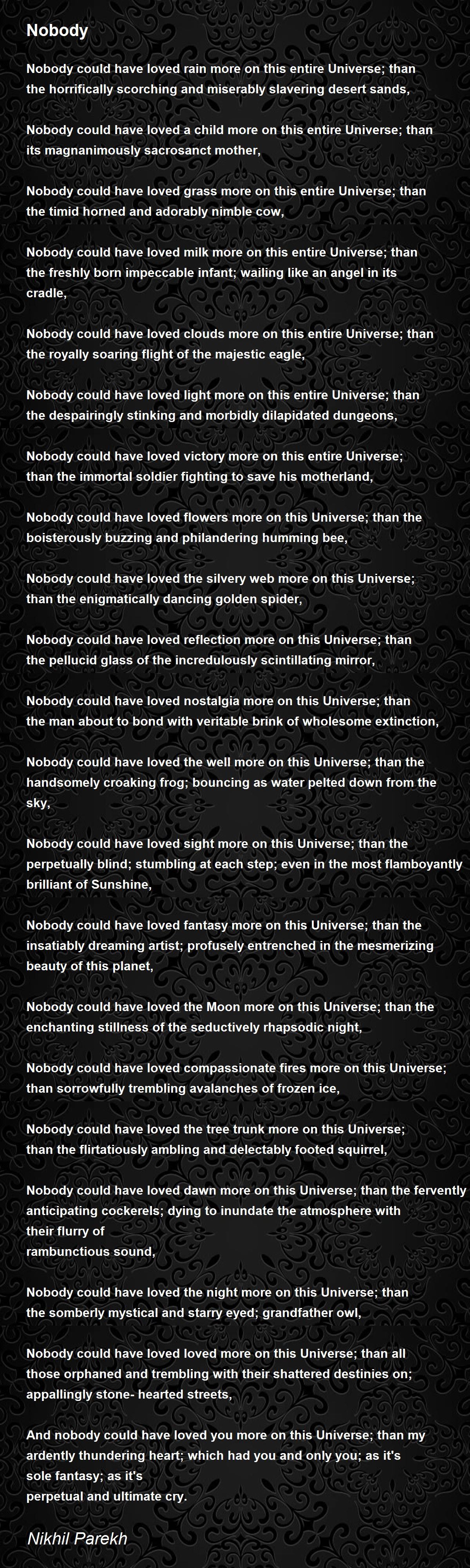 And nobody could have loved you more on this Universe; than my ardently thundering heart; which had you and only you; as it's sole fantasy; as it's