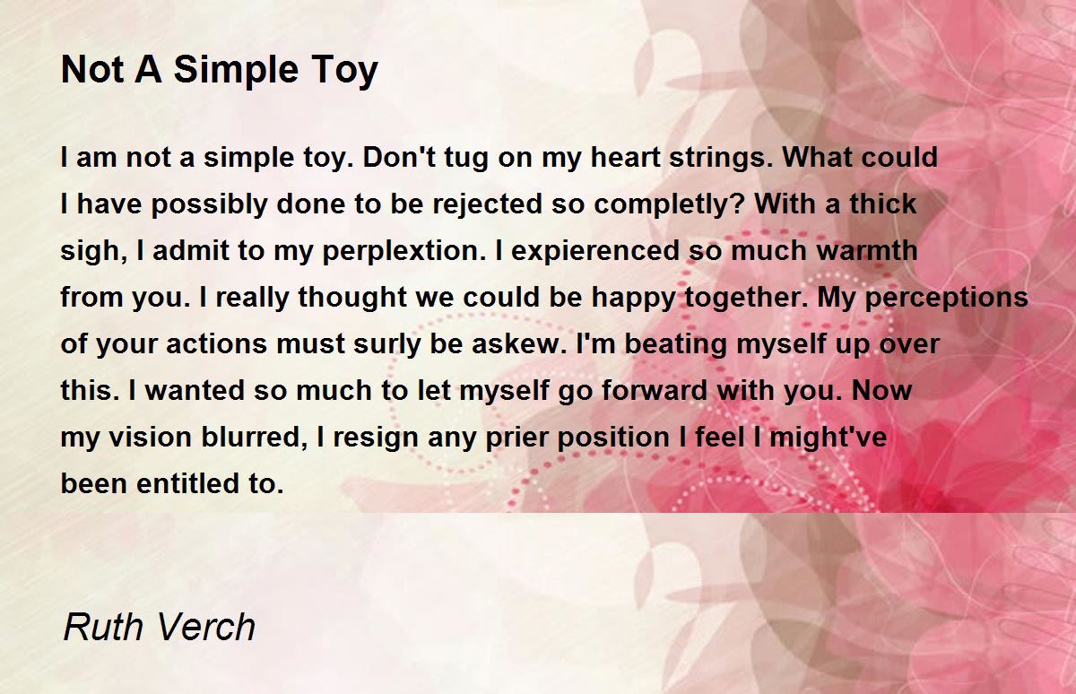 I am not a simple toy. Don't tug on my heart strings. What could I have possibly done to be rejected so completly? With a thick sigh, I admit to my perplextion. I expierenced so much warmth from you. I really thought we could be happy together. My perceptions of your actions must surly be askew. I'm beating myself up over this. I wanted so much to let myself go forward with you. Now my vision blurred, I resign any prier position I feel I might've been entitled to.