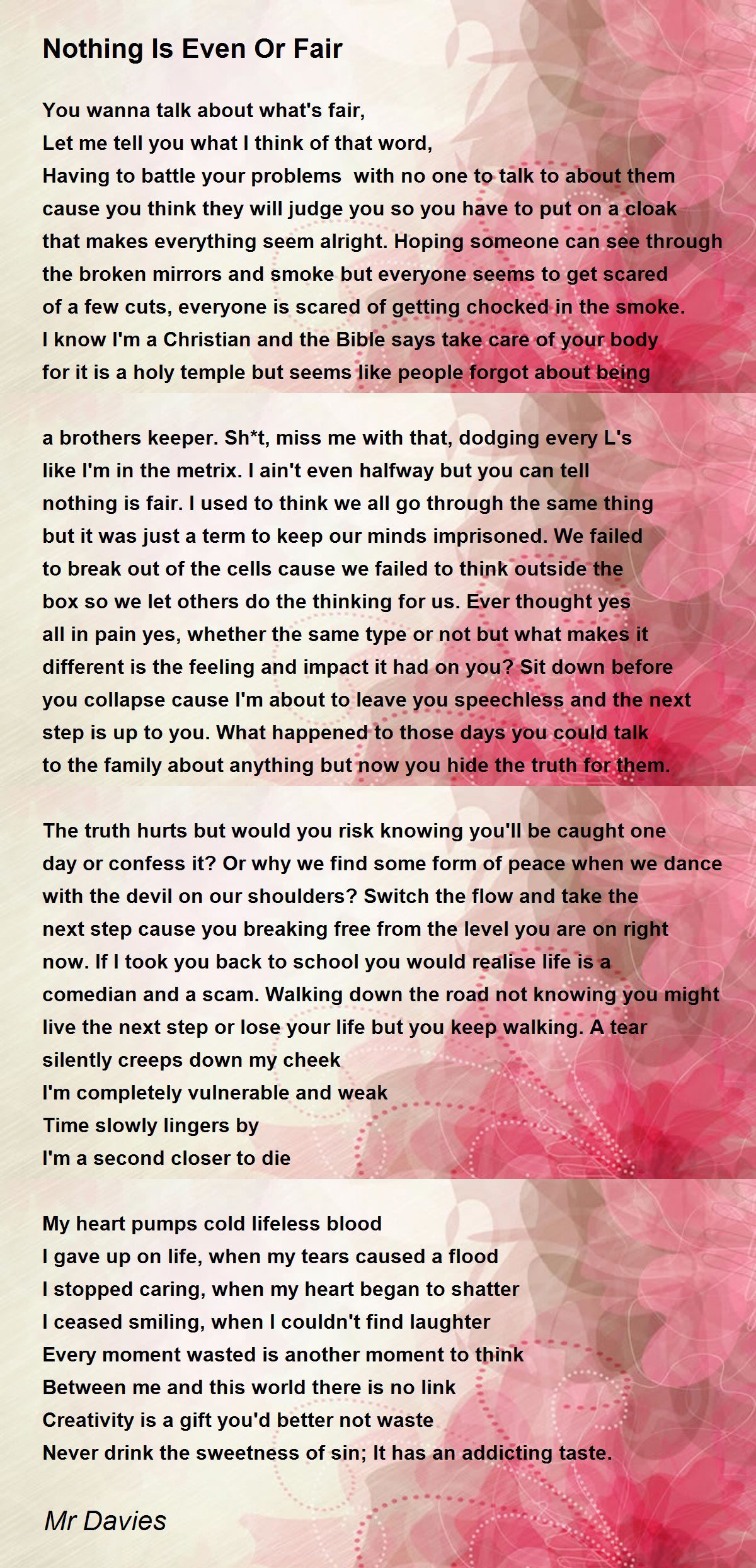 Having to battle your problems with no one to talk to about them cause you think they will judge you so you have to put on a cloak that makes everything seem alright. Hoping someone can see through the broken mirrors and smoke but everyone seems to get scared of a few cuts, everyone is scared of getting chocked in the smoke. I know I'm a Christian and the Bible says take care of your body for it is a holy temple but seems like people forgot about being a brothers keeper. Sh*t, miss me with that, dodging every L's like I'm in the metrix. I ain't even halfway but you can tell nothing is fair. I used to think we all go through the same thing but it was just a term to keep our minds imprisoned. We failed to break out of the cells cause we failed to think outside the box so we let others do the thinking for us. Ever thought yes all in pain yes, whether the same type or not but what makes it different is the feeling and impact it had on you? Sit down before you collapse cause I'm about to leave you speechless and the next step is up to you. What happened to those days you could talk to the family about anything but now you hide the truth for them. The truth hurts but would you risk knowing you'll be caught one day or confess it? Or why we find some form of peace when we dance with the devil on our shoulders? Switch the flow and take the next step cause you breaking free from the level you are on right now. If I took you back to school you would realise life is a comedian and a scam. Walking down the road not knowing you might live the next step or lose your life but you keep walking. A tear silently creeps down my cheek